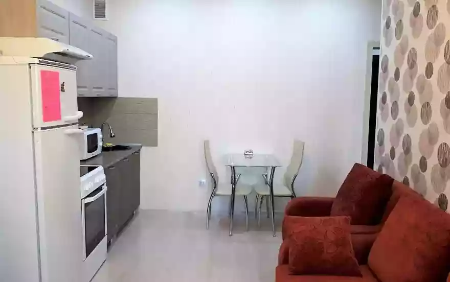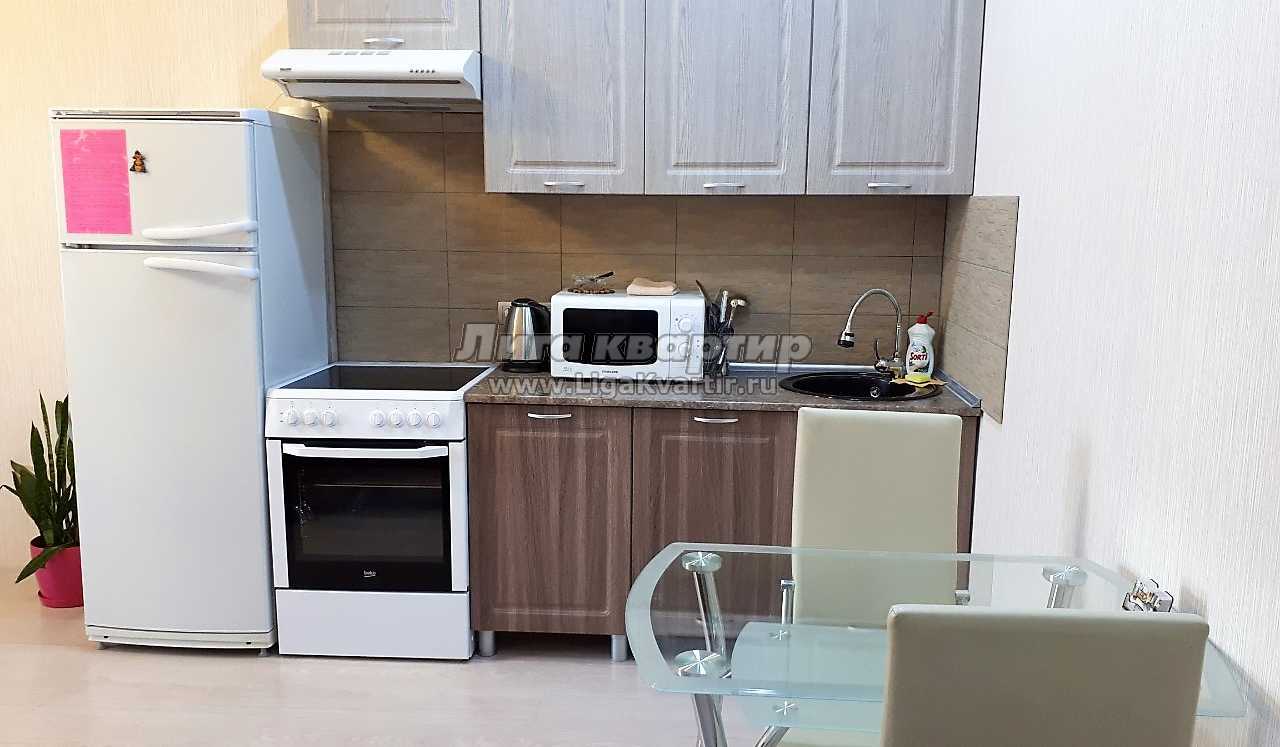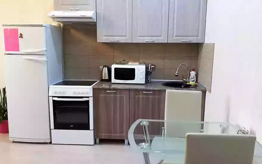 Кухня оформлена в современном стиле, кухонный гарнитур, новая бытовая техника (электрическая плита, микроволновая печь, холодильник, чайник), вся необходимая посуда.