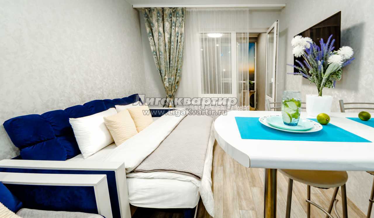 Отдохните в комфортной студии на с видом на море. И до песчаного, и до каменистого пляжа всего 5 минут пешком! В спальной зоне просторный двуспальный диван. В зоне отдыха дополнительное кресло-кровать.