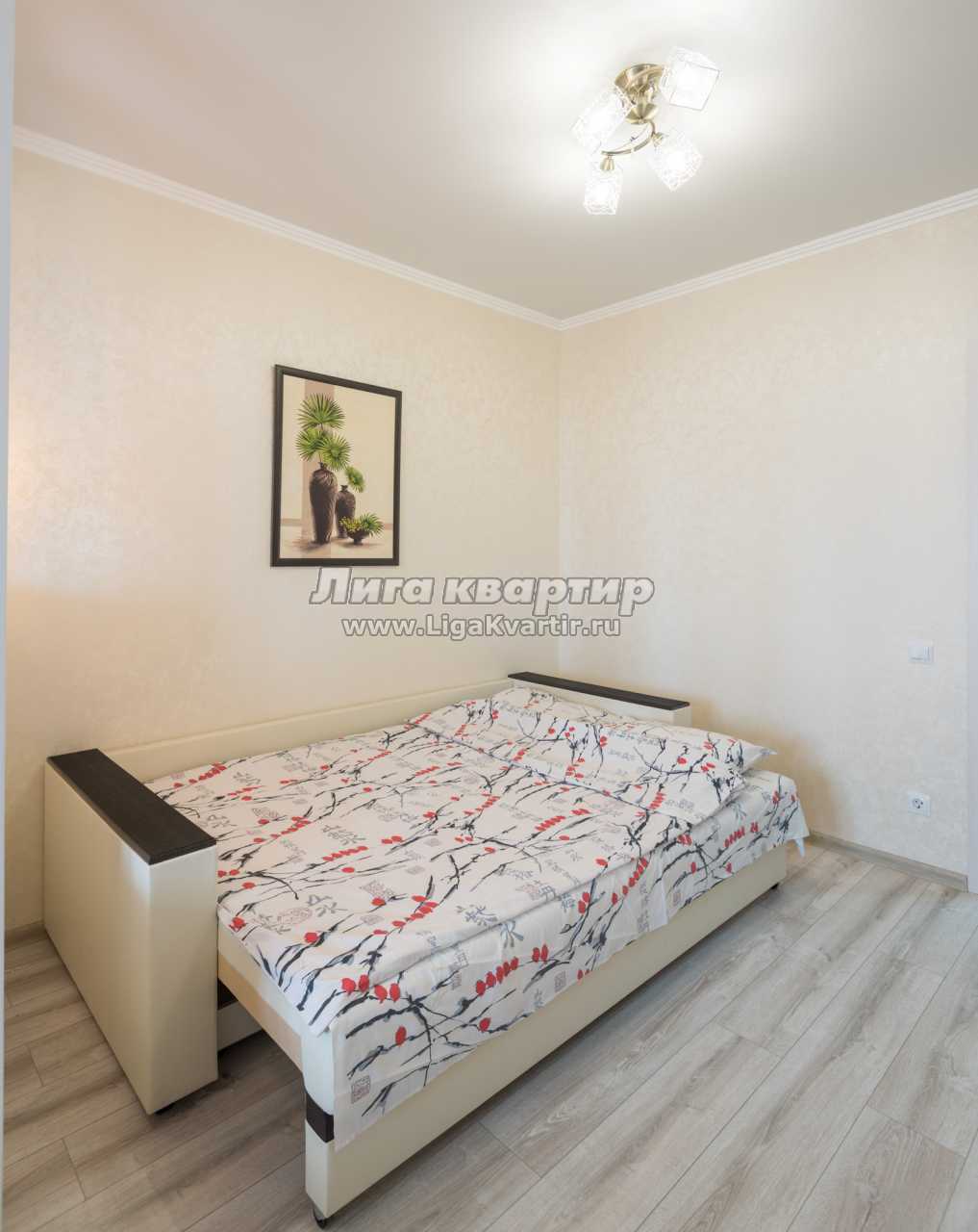 В просторной спальне двуспальная кровать с ортопедическим матрасом и удобный раскладной диван-кровать.