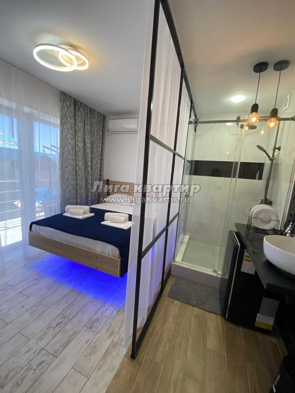 Двухместный номер для раскрепощенных пар выполнен по дизайнерскому проекту. Парящая кровать, прозрачная душевая кабина, теплый пол (в холодное время года) и уютная атмосфера создадут настроение для романтической встречи!