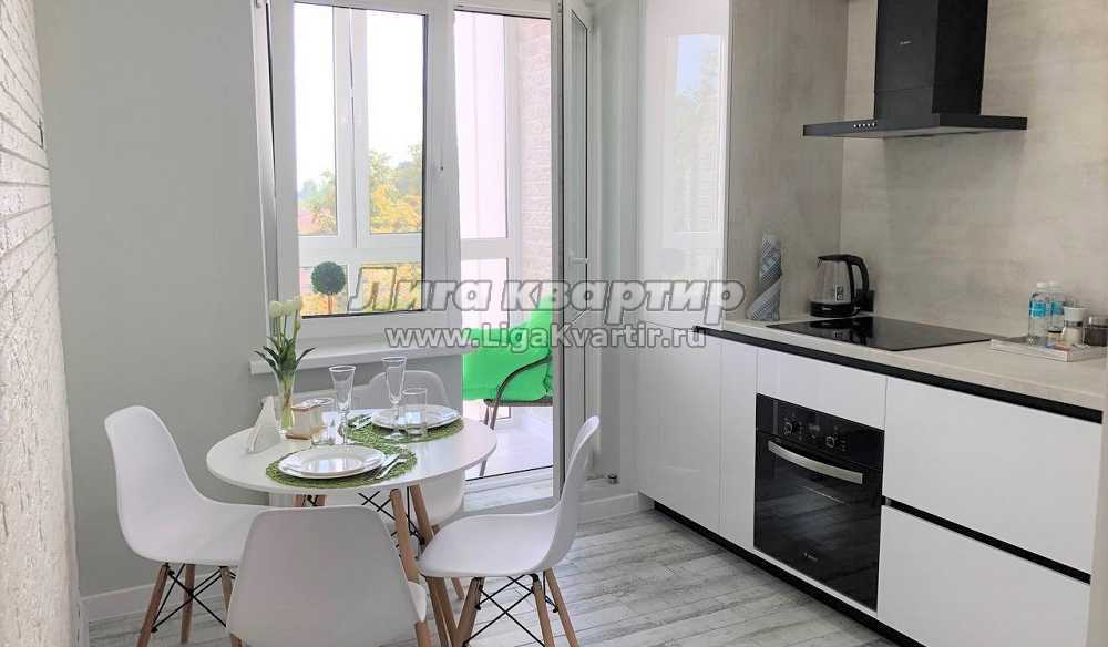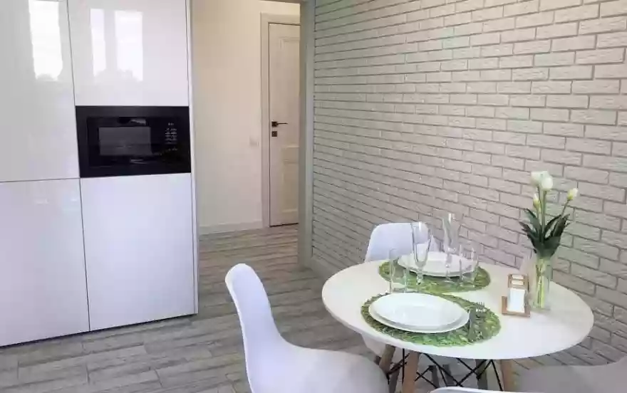 Кухня, выполненная в светлых тонах, укомплектована всем необходимым для приготовления пищи. Из кухни есть выход на компактный балкон, где обустроена зона отдыха для наших гостей - небольшой кофейный столик и два кресла.