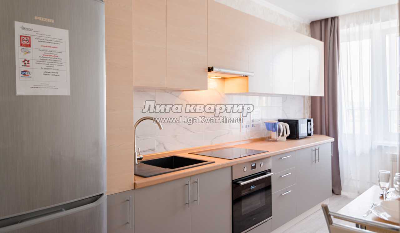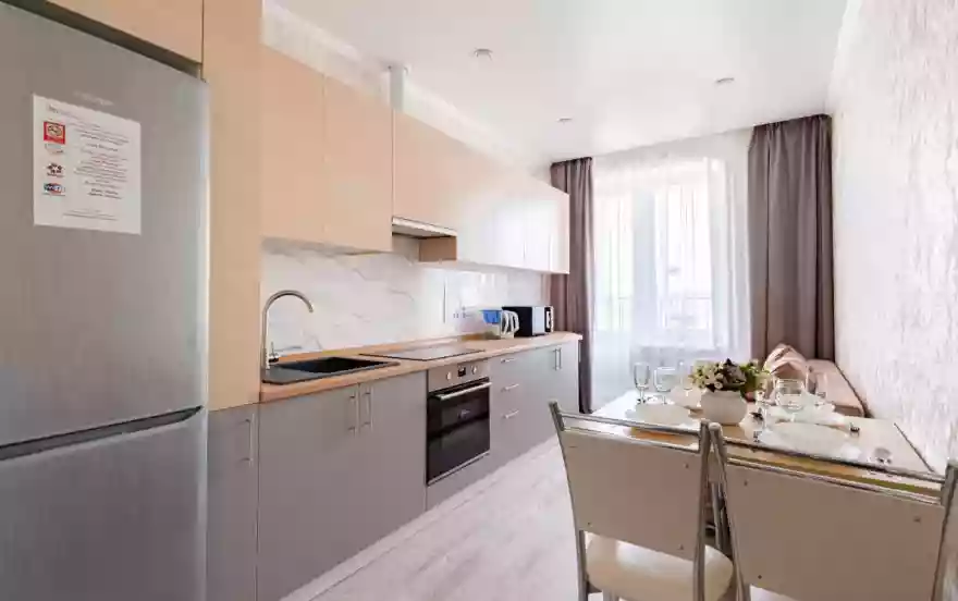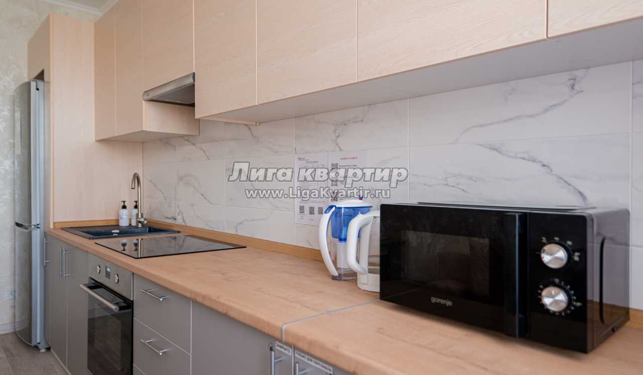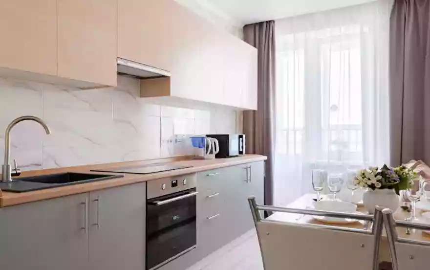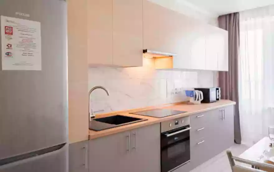 -Полностью оборудованная кухня (холодильник, электрическая варочная панель, духовой шкаф, вытяжка, микроволновая печь, электрический чайник, фильтр для питьевой воды)