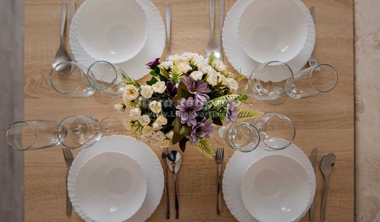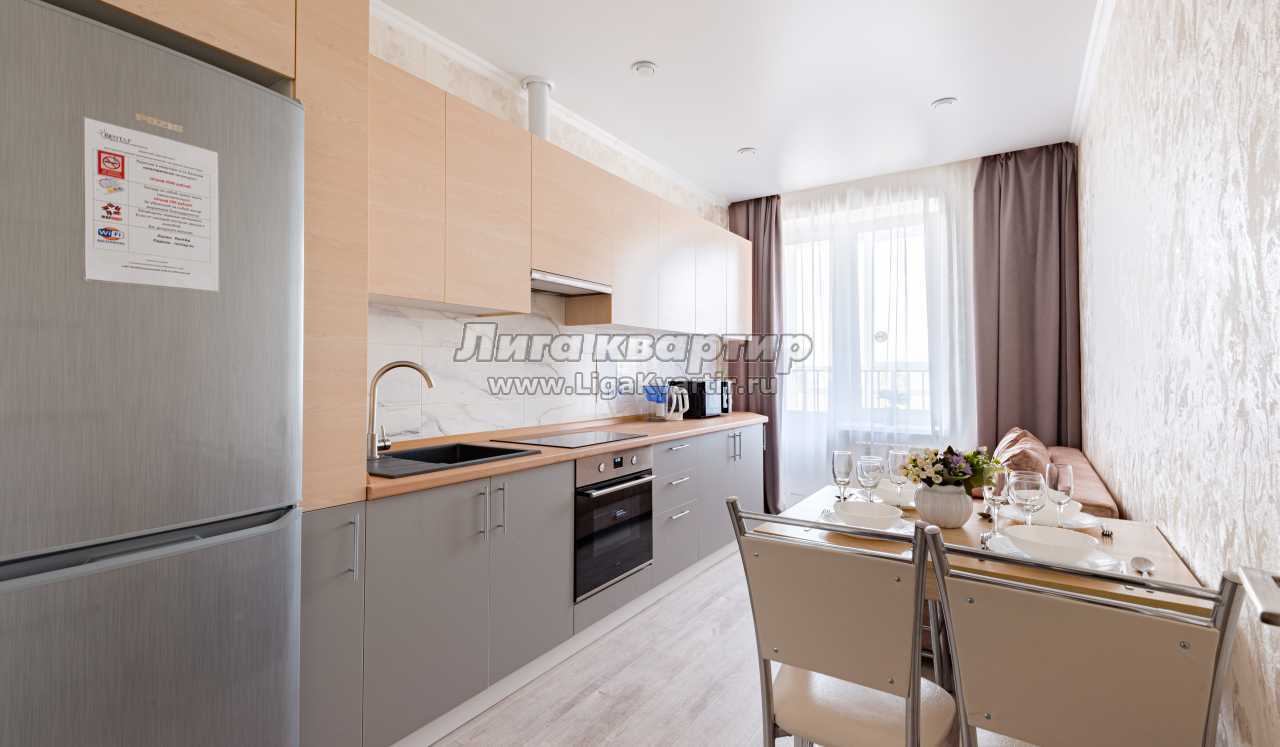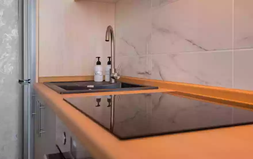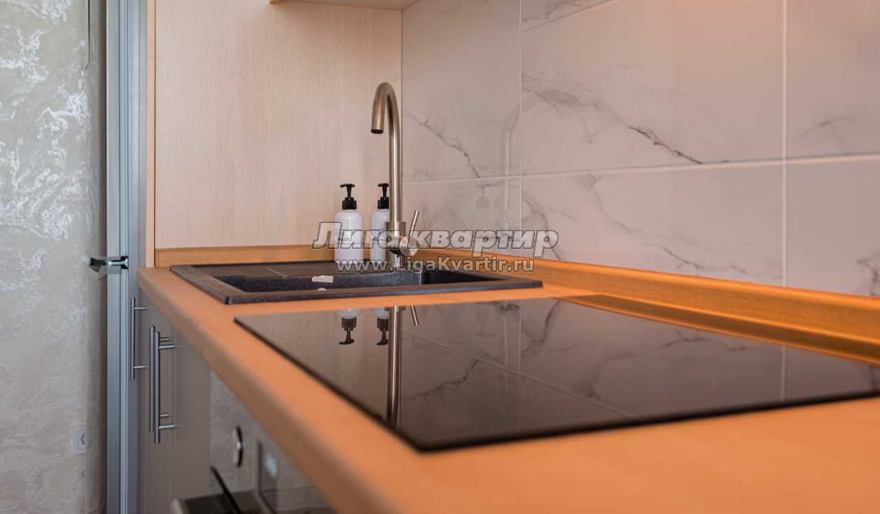 -Полностью оборудованная кухня (холодильник, электрическая варочная панель, духовой шкаф, вытяжка, микроволновая печь, электрический чайник, фильтр для питьевой воды)