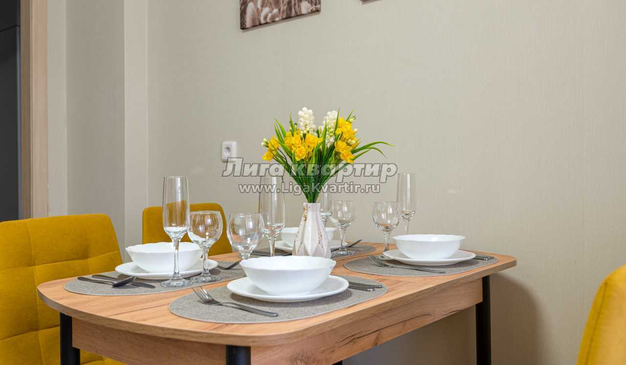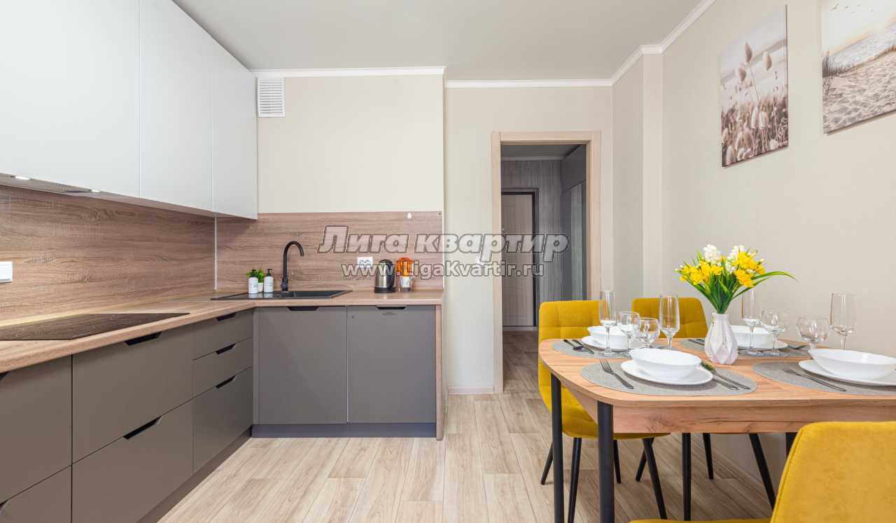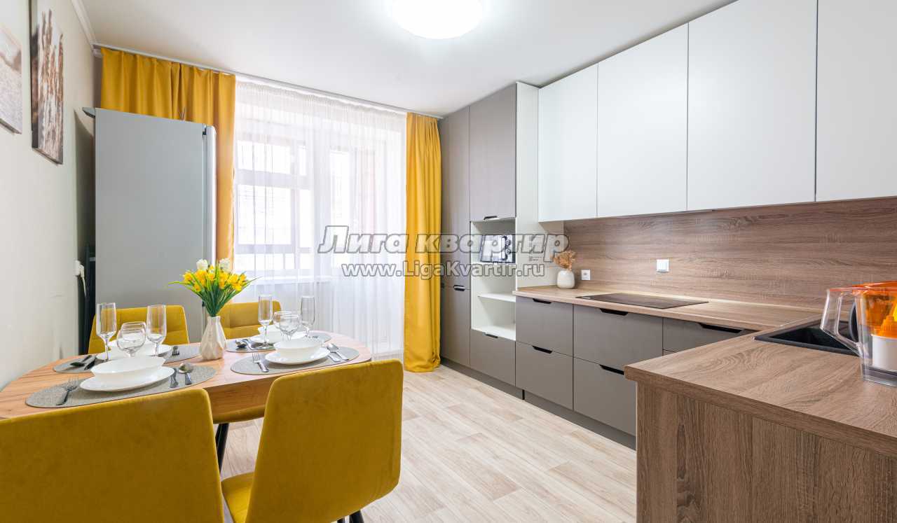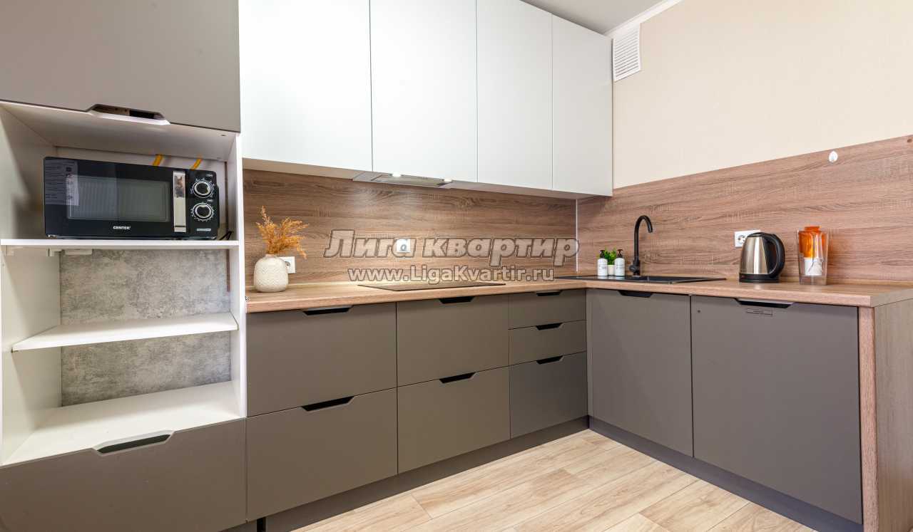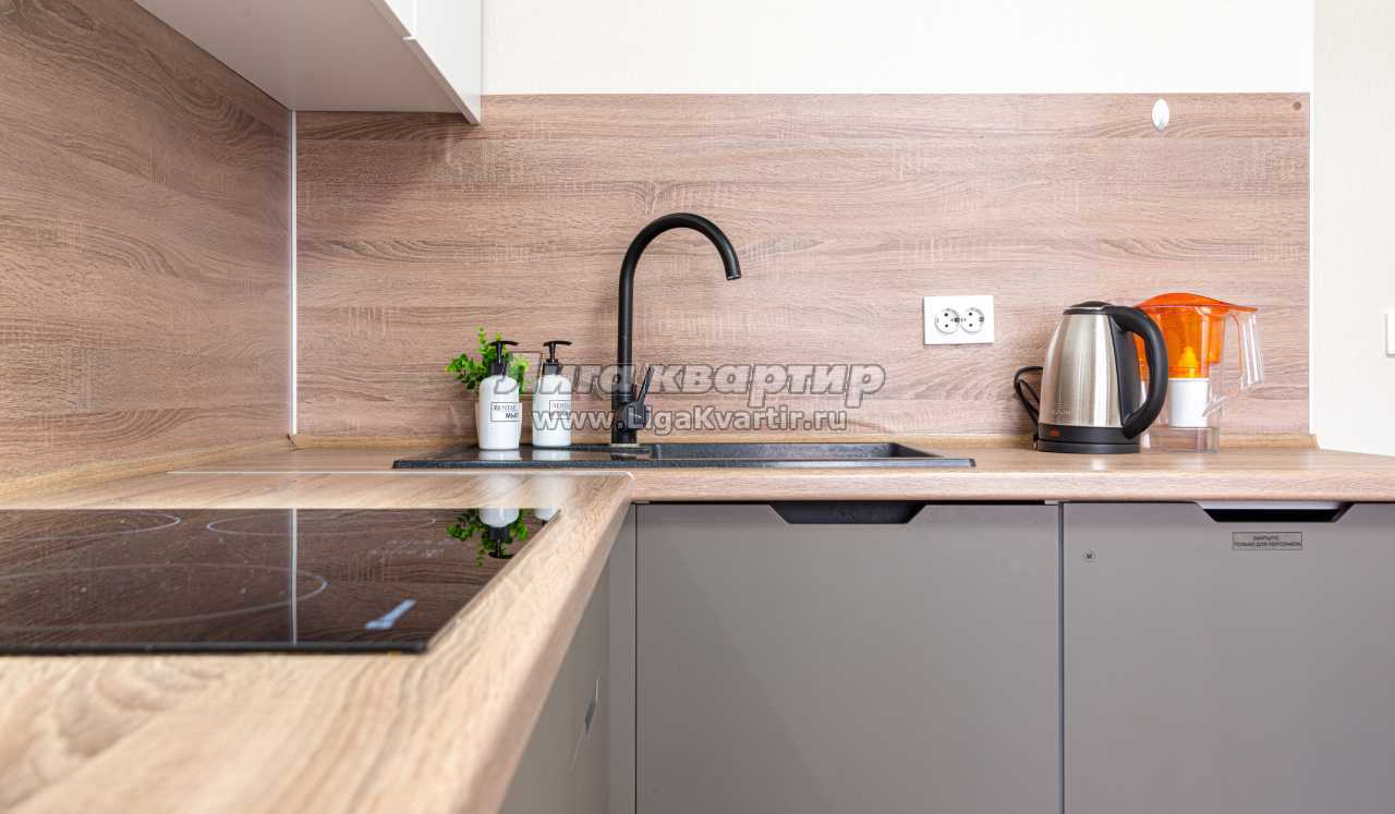 - Полностью оборудованная кухня (холодильник, электрическая варочная панель, вытяжка, микроволновая печь, электрический чайник, фильтр для питьевой воды)
