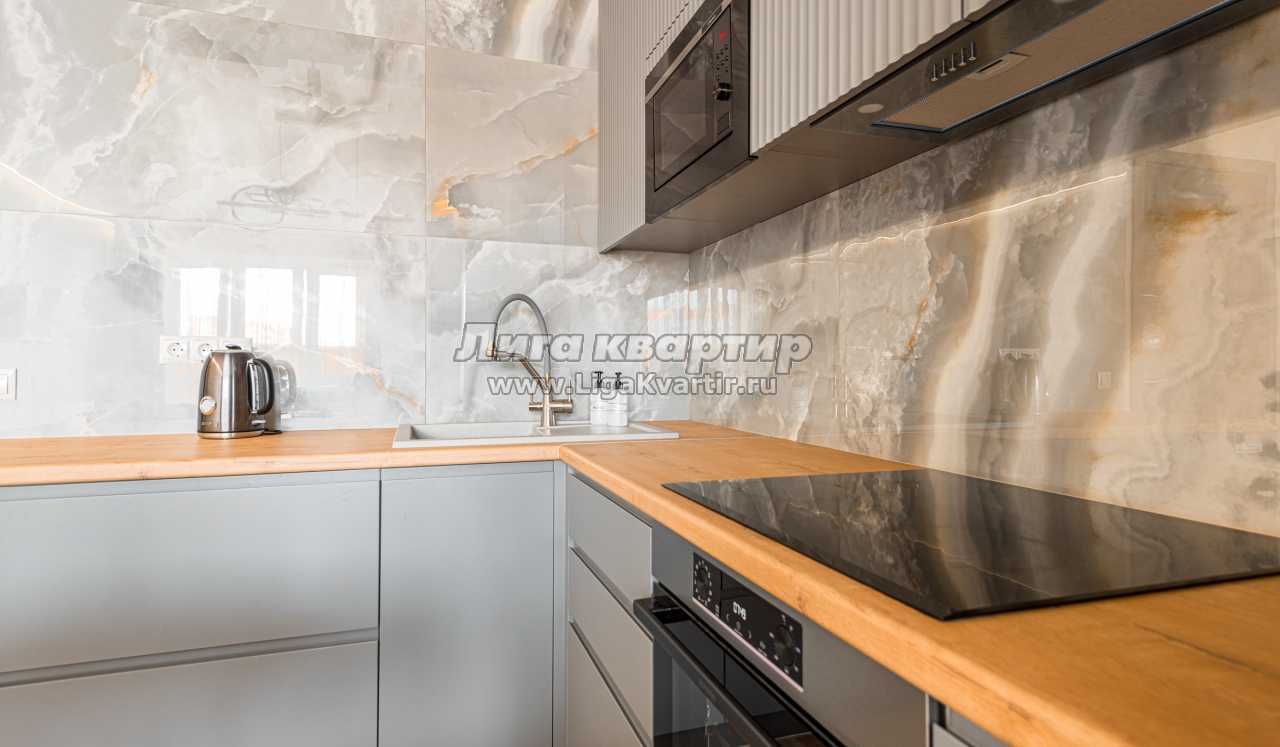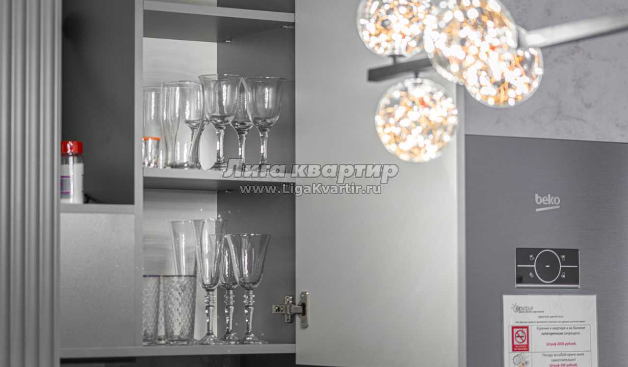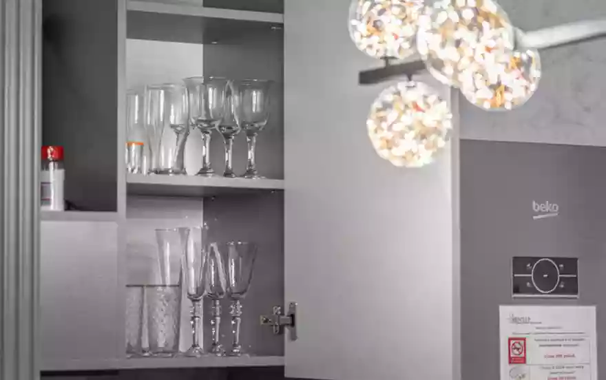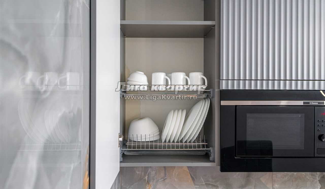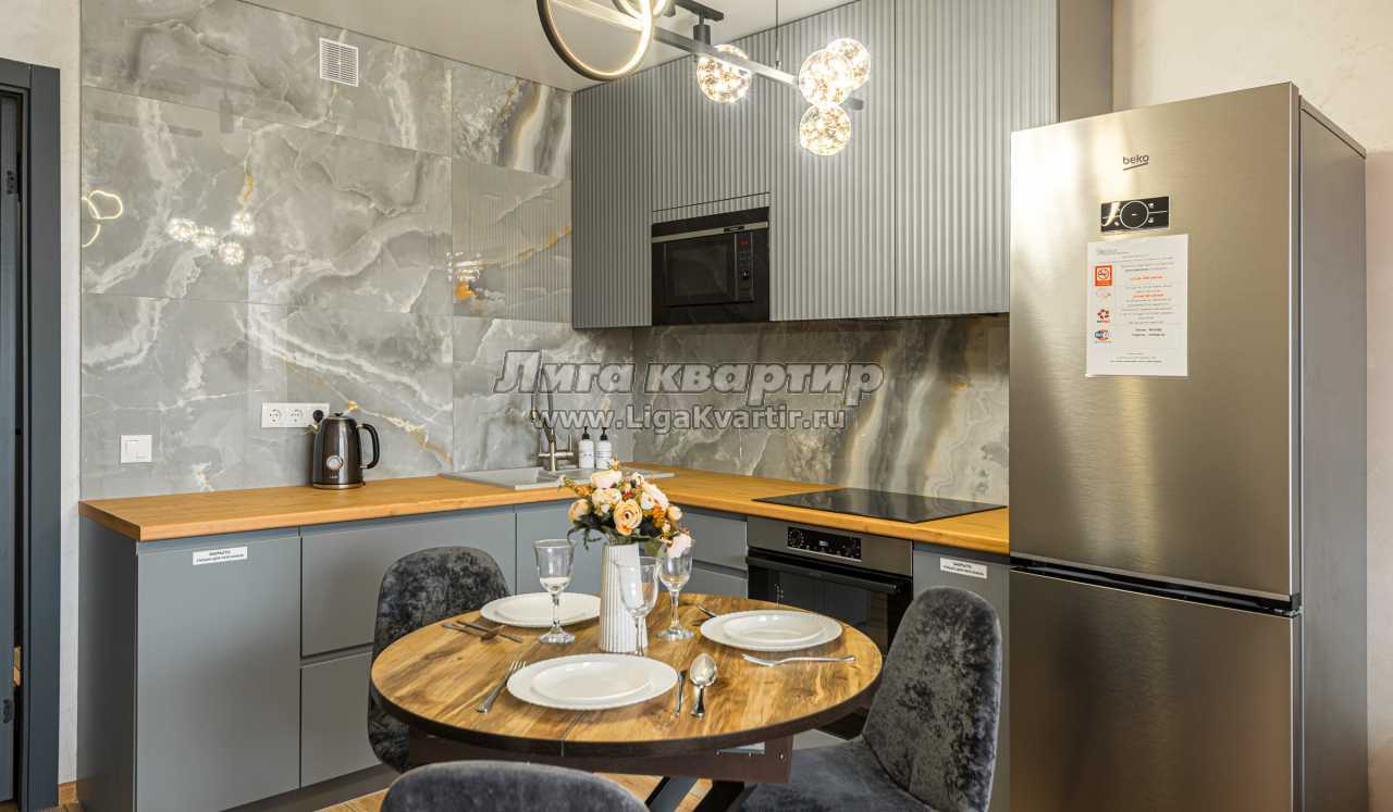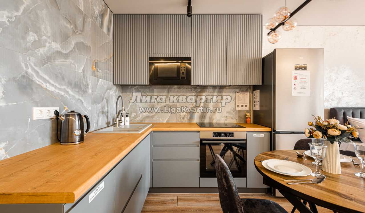 - Полностью оборудованная кухня (холодильник, электрическая варочная панель, духовой шкаф, вытяжка, микроволновая печь, электрический чайник, фильтр для питьевой воды)
