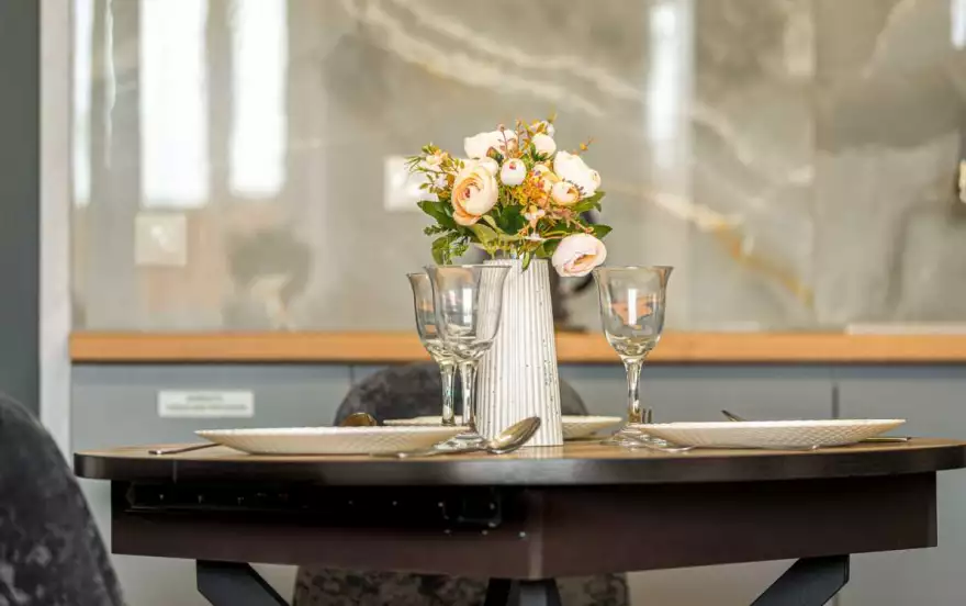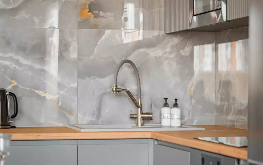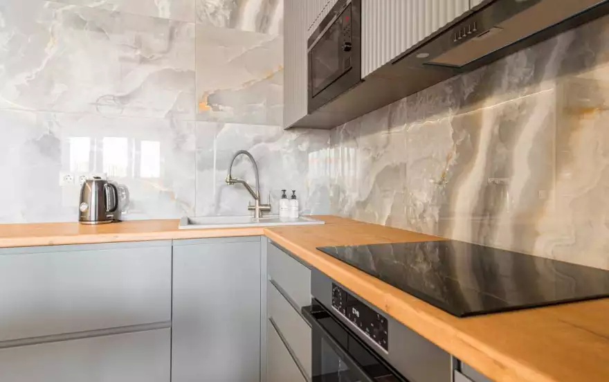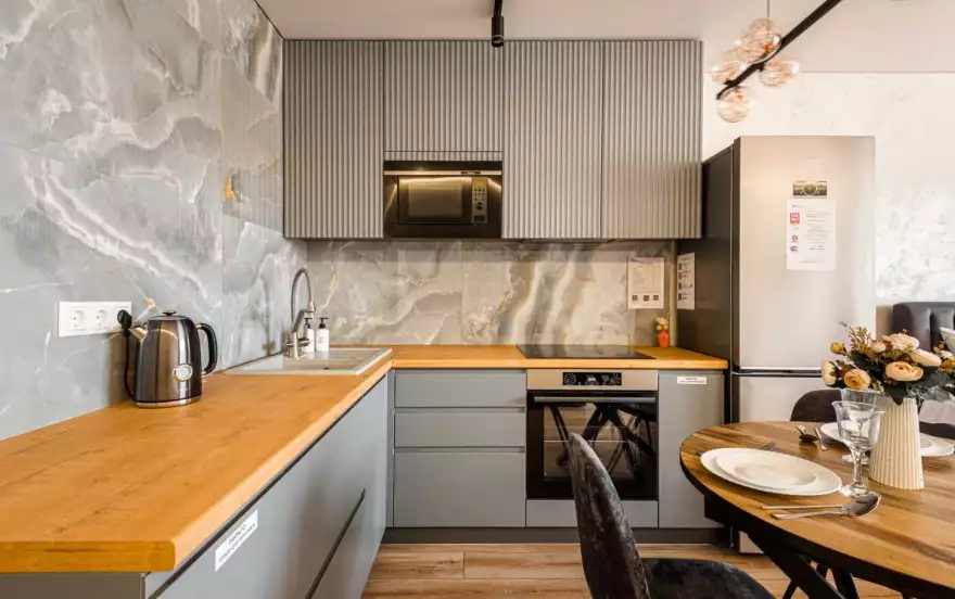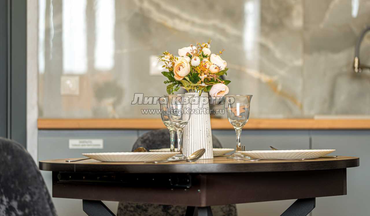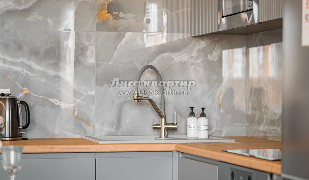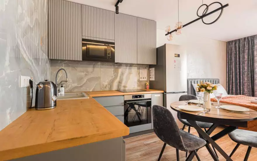 - Полностью оборудованная кухня (холодильник, электрическая варочная панель, духовой шкаф, вытяжка, микроволновая печь, электрический чайник, фильтр для питьевой воды)