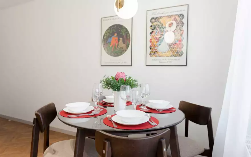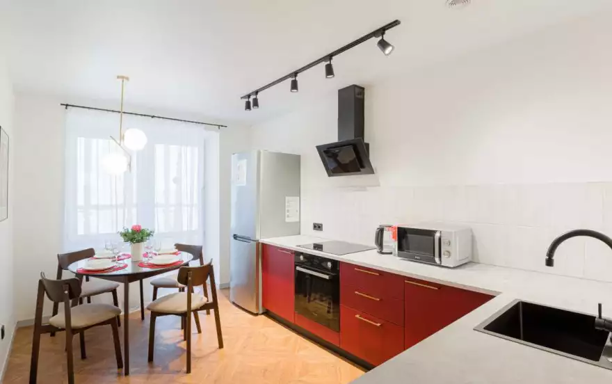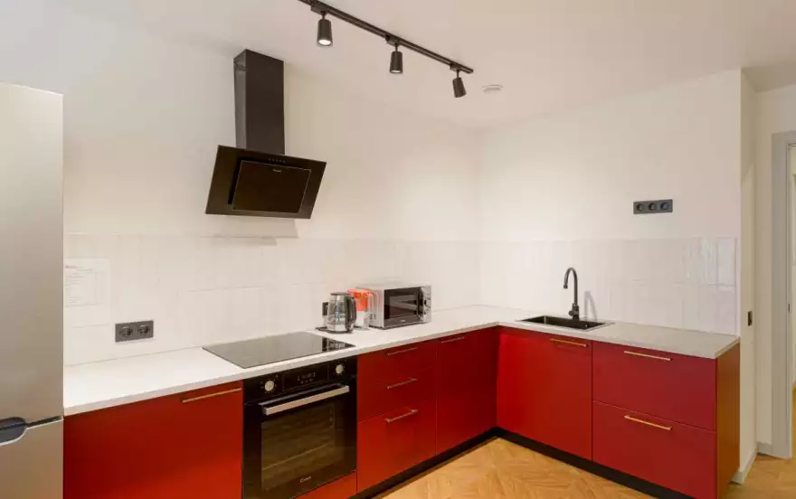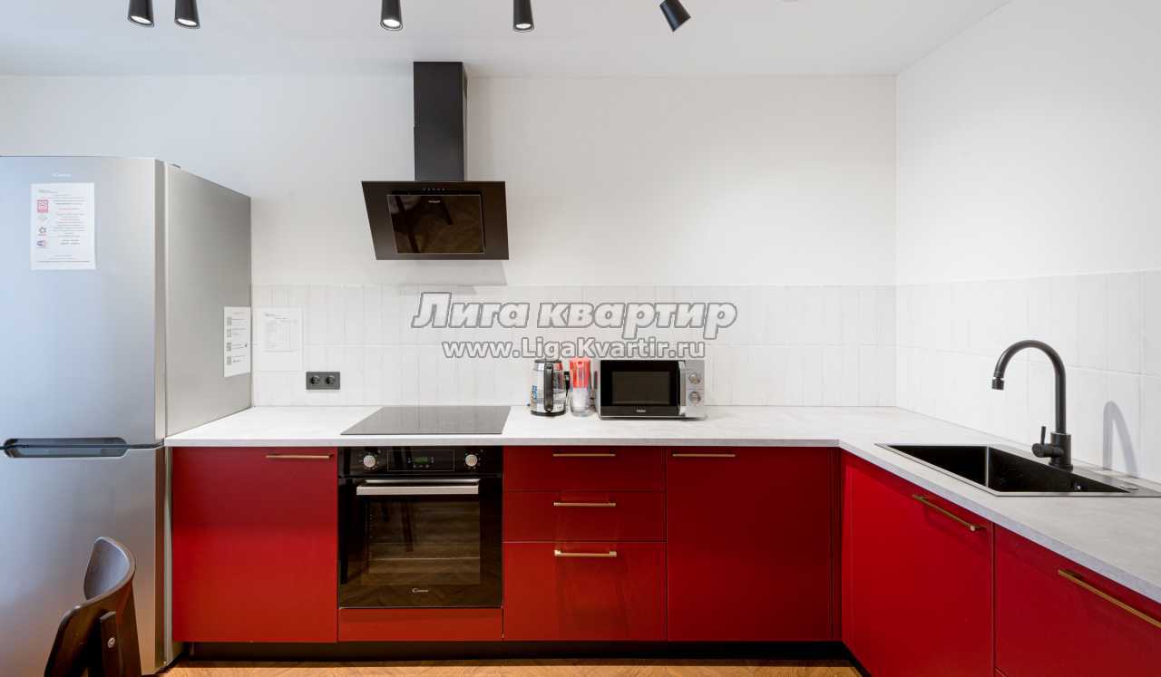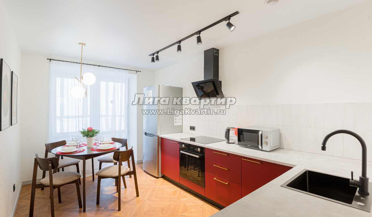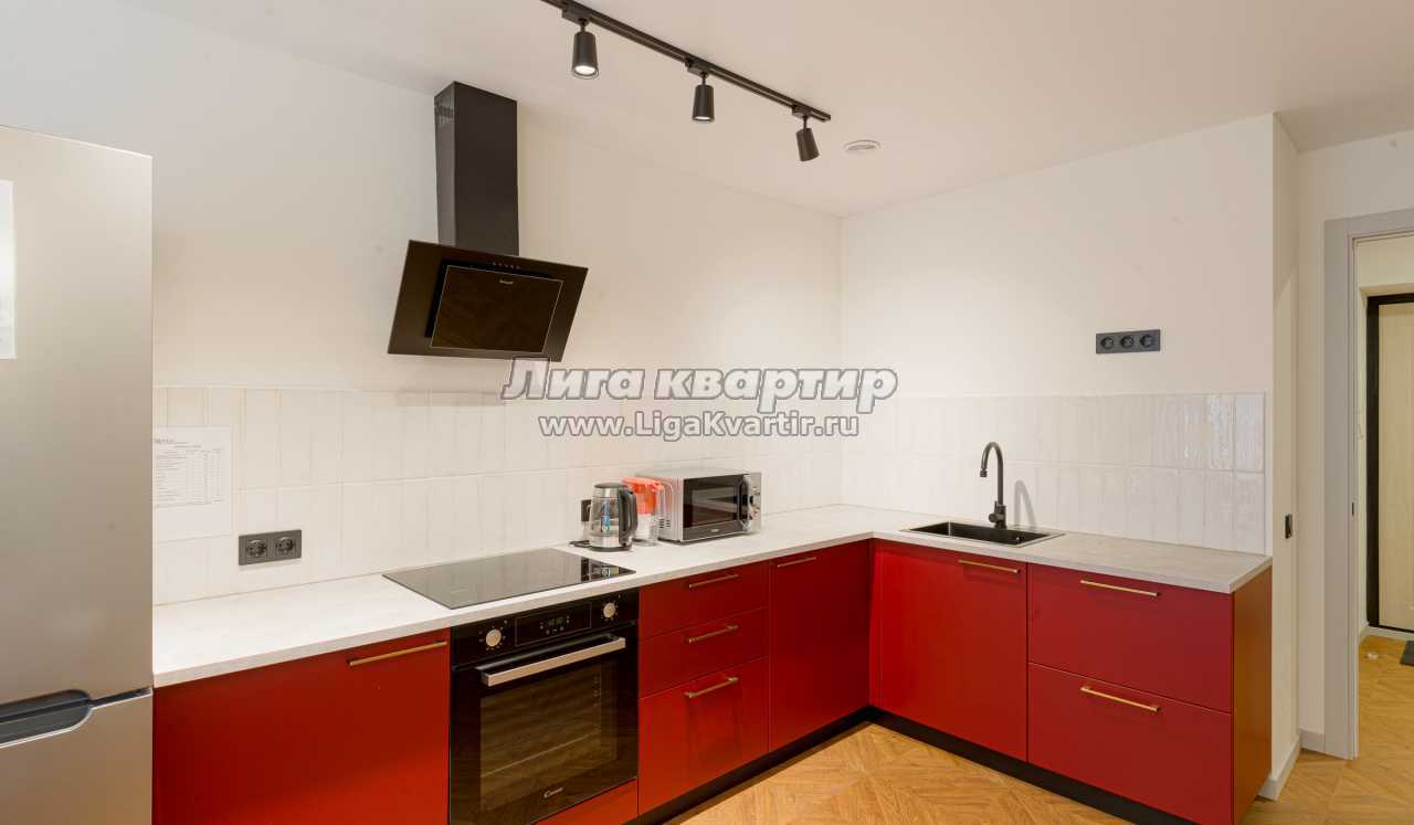 -Полностью оборудованная кухня (холодильник, индукционная варочная панель, духовой шкаф, вытяжка, микроволновая печь, электрический чайник, фильтр для питьевой воды)