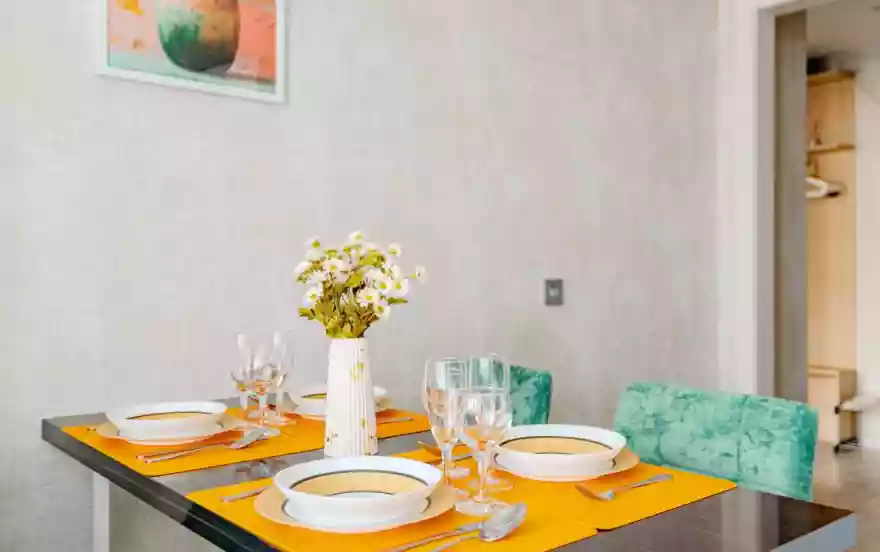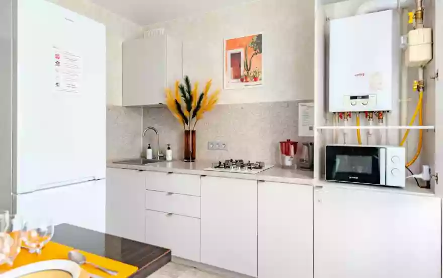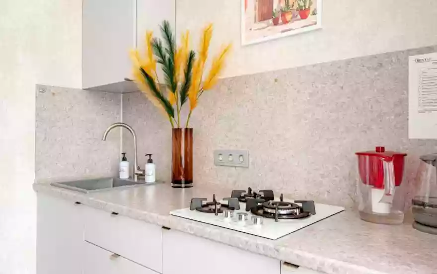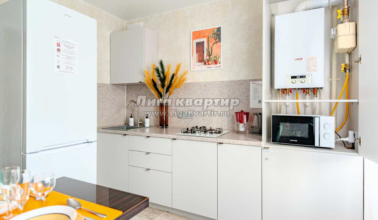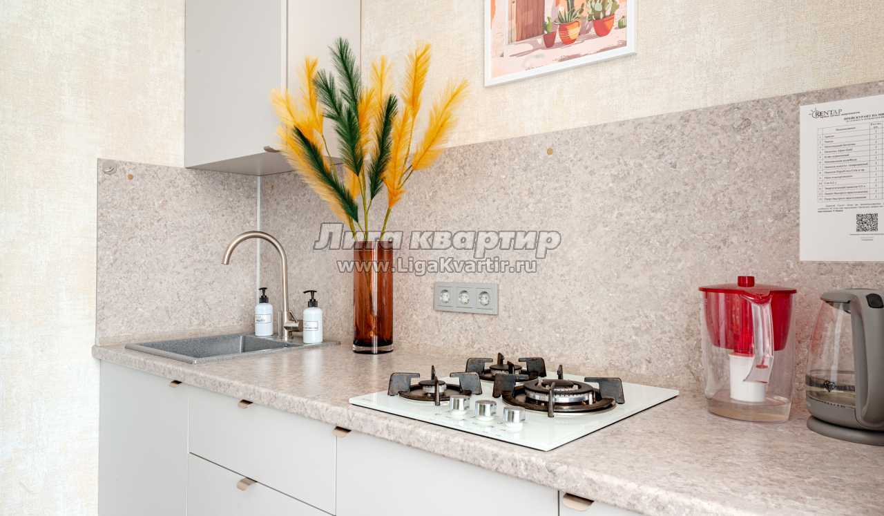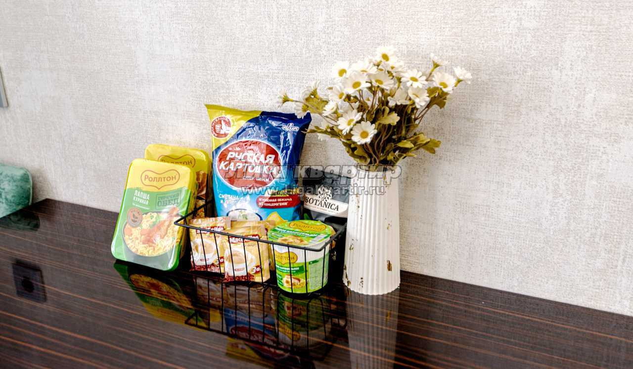 - Полностью оборудованная кухня (холодильник, газовая варочная панель, микроволновая печь, электрический чайник, фильтр для питьевой воды)