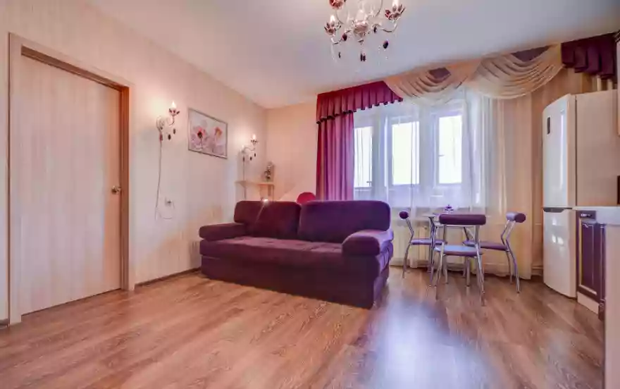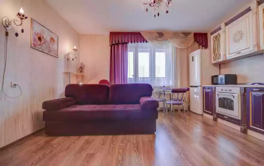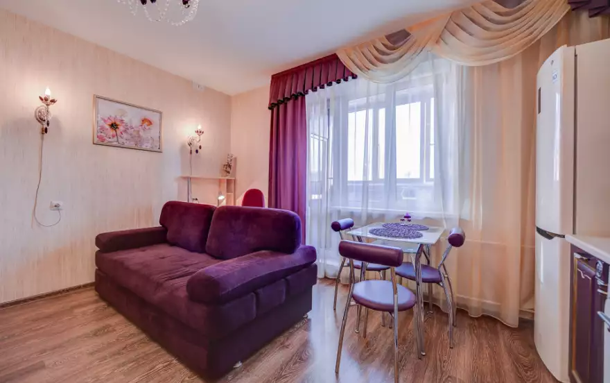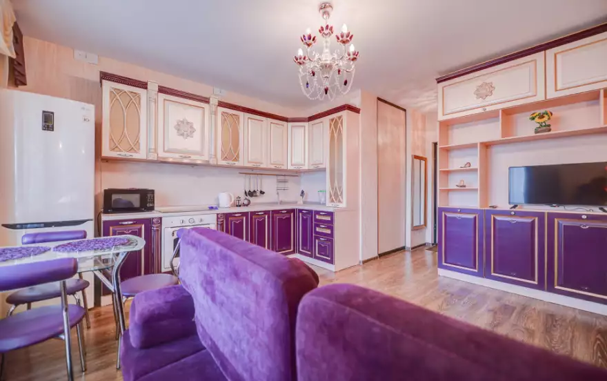 - Гостиная-студия в лиловых оттенках включает в себя зону отдыха - раскладной двуспальный диван, телевизор, кухонную зону с гарнитуром, снабженным всей необходимой бытовой техникой и посудой, обеденную зону - стеклянный стол и стулья.