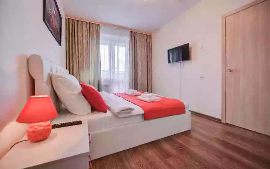 - Основная нейтральная цветовая гамма квартиры подчеркнута стильными яркими аксессуарами. В каждой комнате установлен большой ЖК-телевизор.