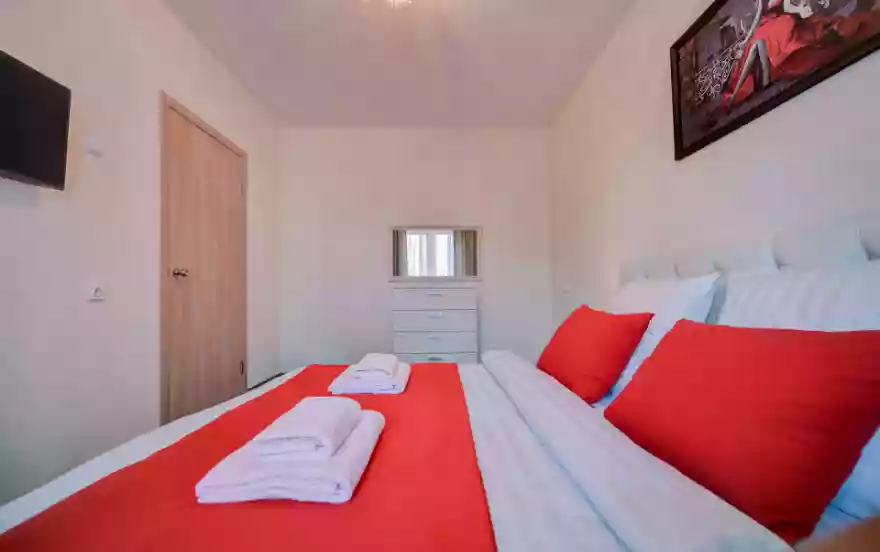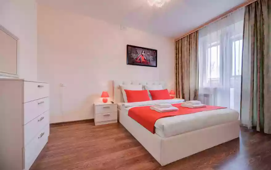 - В спальне выбран алый цвет деталей интерьера. Здесь, большая двуспальная кровать с ортопедическим матрасом, комод и большое настенное зеркало. Плотные портьеры, прикроватные тумбы с красивыми светильниками создают дополнительный уют комнаты.