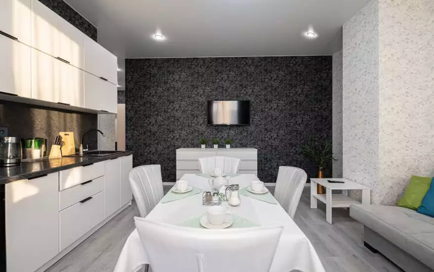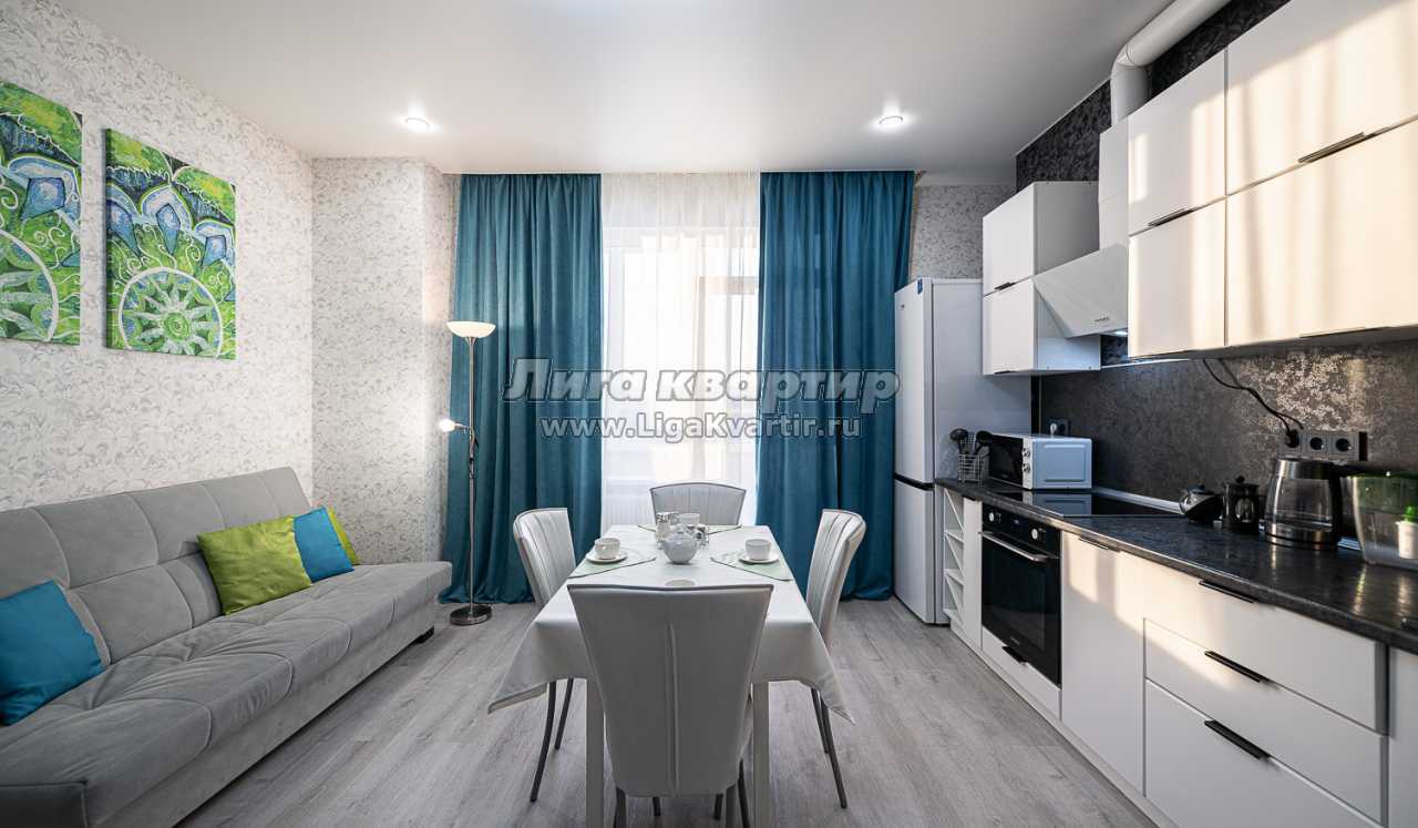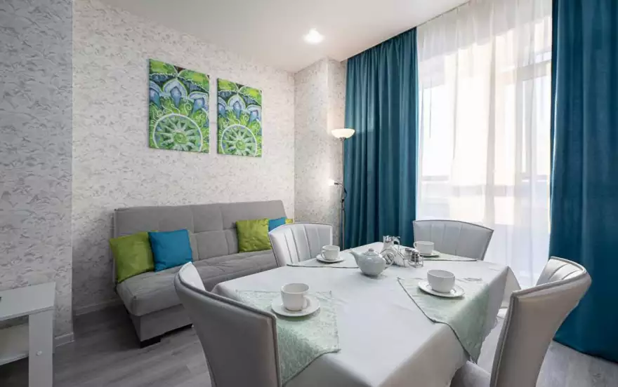 - Каждый гость, переступив порог гостиной, сразу попадает в атмосферу уюта, легкости и свежести. Мягкий раскладной диван отлично послужит для комфортного отдыха и при необходимости, образует полноценное двуспальное место. Для проведения досуга гостям доступны высокоскоростной Wi-Fi и кабельное телевидение с каналами различной тематики. Для размещения вещей послужит журнальный стол и комод. Гостиная прекрасно совмещена с кухонной зоной. Благодаря белоснежному кухонному гарнитуру, наличию всей бытовой техники, светлой обеденной зоне, набору посуды и кухонных принадлежностей, гости могут в полной мере насладиться привычными блюдами на свой вкус.