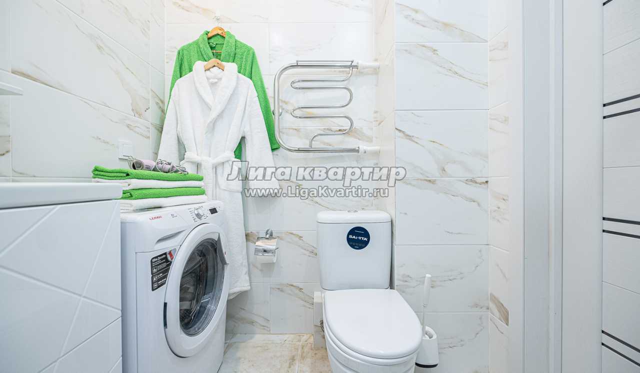 - Санузел оборудован белоснежной новой сантехникой и мебелью. В наличии все принадлежности для полноценного личного ухода: от стиральной машины-автомат до фена.