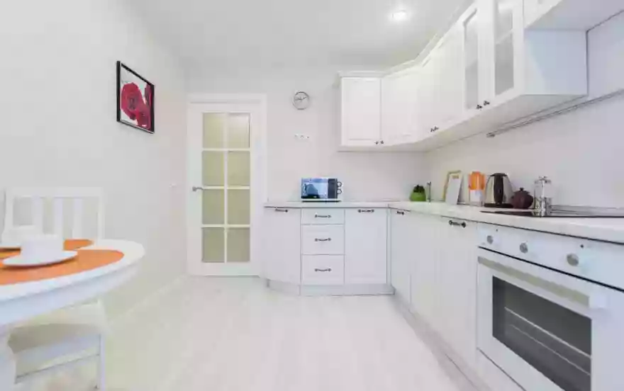 - По-домашнему уютная кухня оснащена современным белым гарнитуром, всей нужной для длительного проживания бытовой техникой и полным комплектом посуды и кухонной утвари на четверых гостей, для приготовления привычного рациона по своему вкусу. Обеденная зона с круглым столом и стульями сделает душевной любую трапезу и чаепитие.