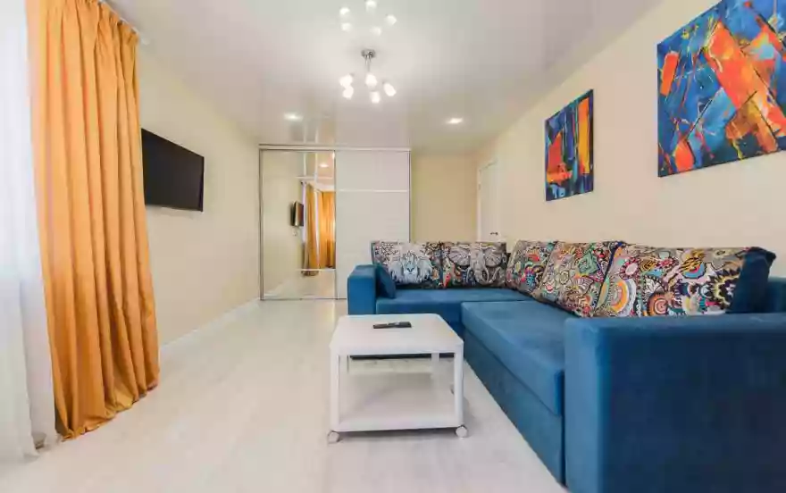 - Яркая гостиная с дизайнерским угловым диваном, журнальным столом и ЖК-телевизором с большой диагональю обеспечат приятное досуговое времяпрепровождение. Диван легко трансформируется в полноценное двуспальное место. В гостиной два окна и выход на балкон. В большом зеркальном шкафу-купе можно расположить все личные вещи.