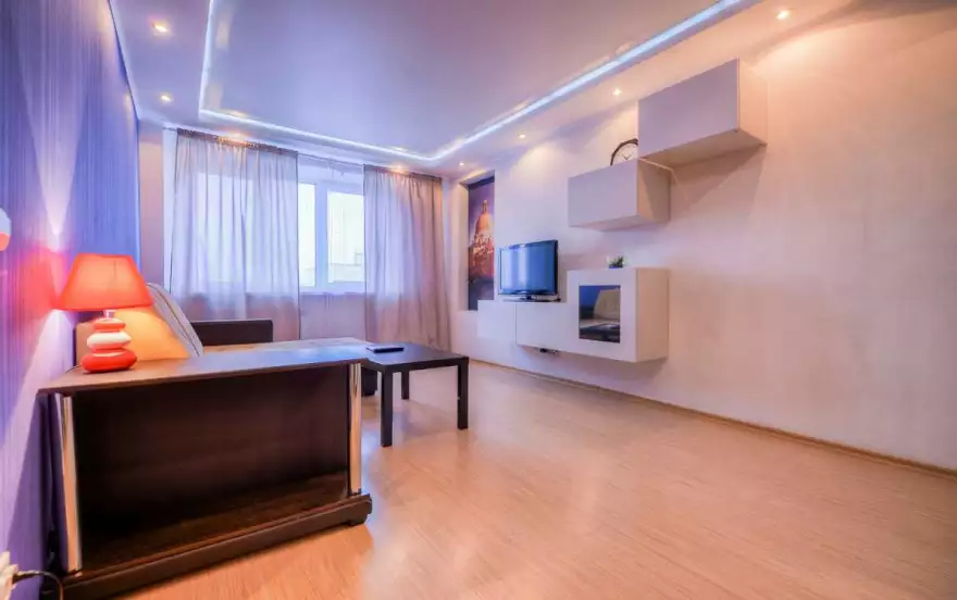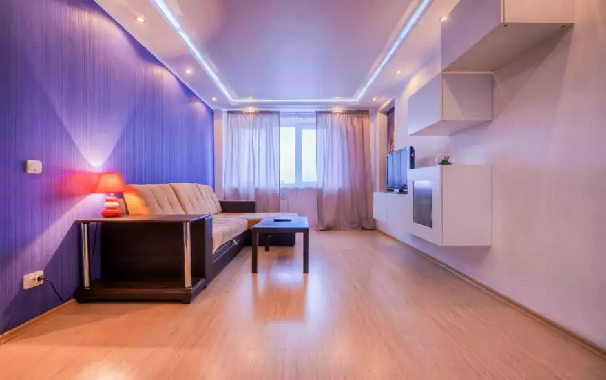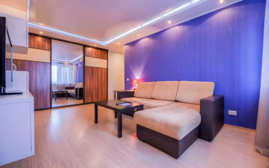 - В яркой гостиной большой удобный раскладной диван, легко трансформирующийся в двуспальное место. Есть большой ЖК телевизор, журнальный стол. В качестве необычной детали интерьера привлекает внимание настенная картина. Предусмотрен вместительный зеркальный шкаф-купе.