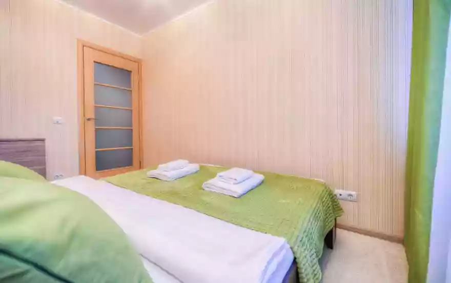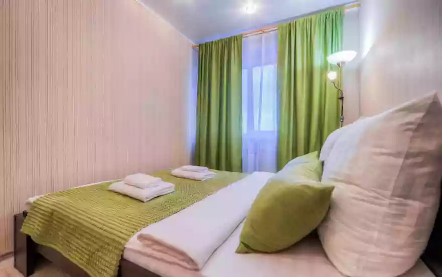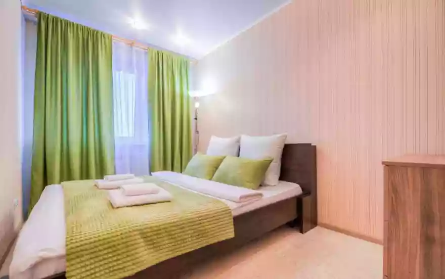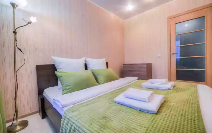 - Спальня выполнена в спокойных естественных и зеленых тонах. Большая двуспальная кровать оснащена ортопедическим матрасом. Для удобства гостей присутствует комод для хранения вещей и напольный светильник.