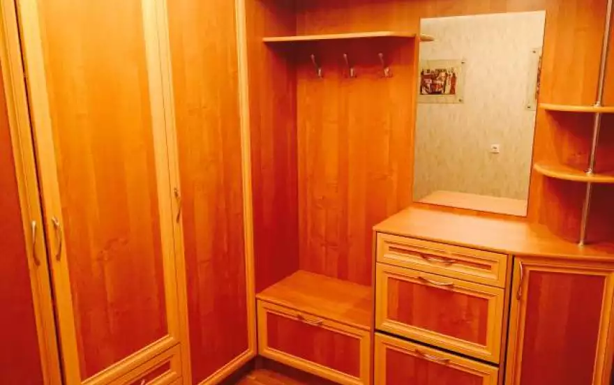 есть вся необходимая мебель, в одной спальне двуспальная кровать и большой кожаный диван, который разбирается и имеет ортопедическое основание, большая стенка с шкафом, в другой спальне также большая кровать и большой комод, телевизор в каждой комнате, в прихожей имеются большие шкафы, полки и обувницы.