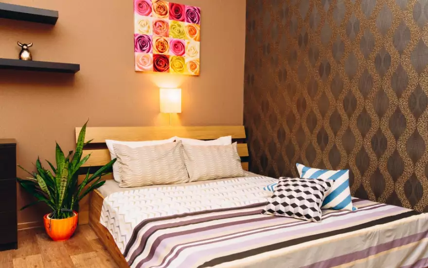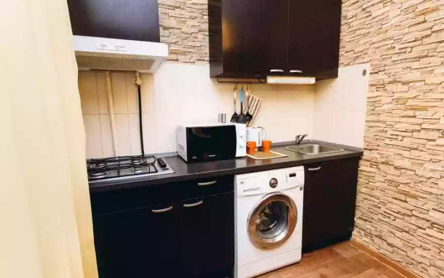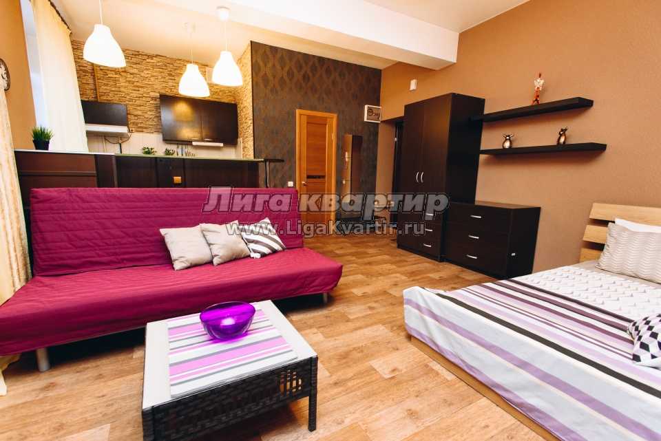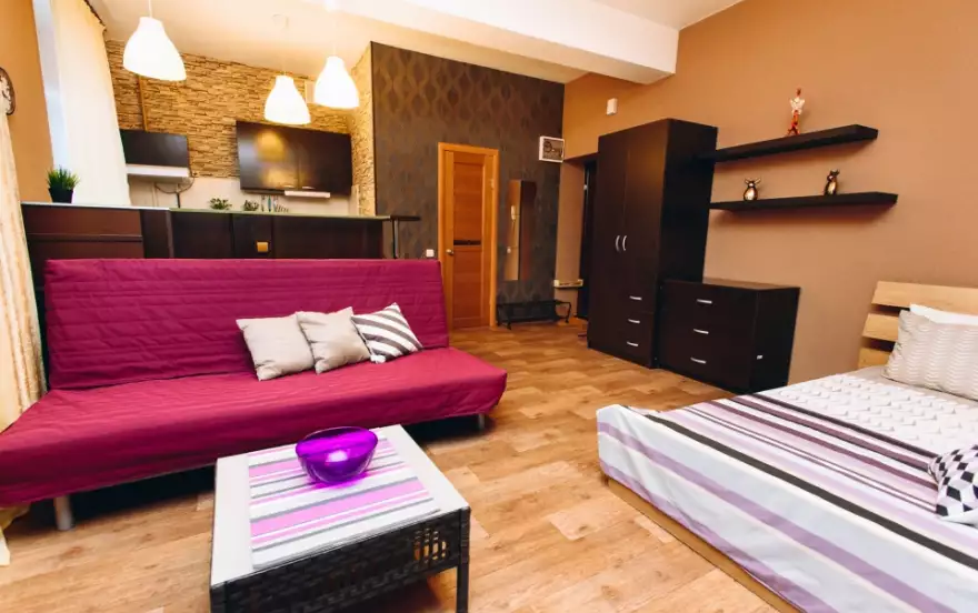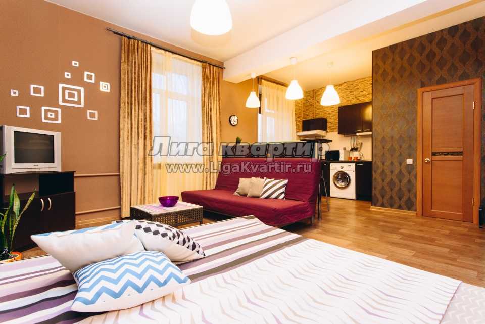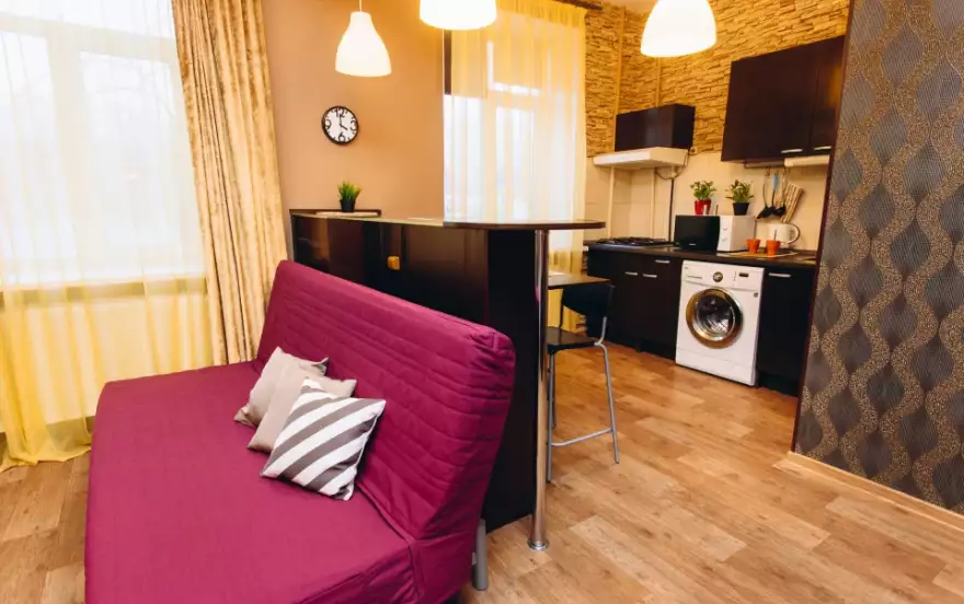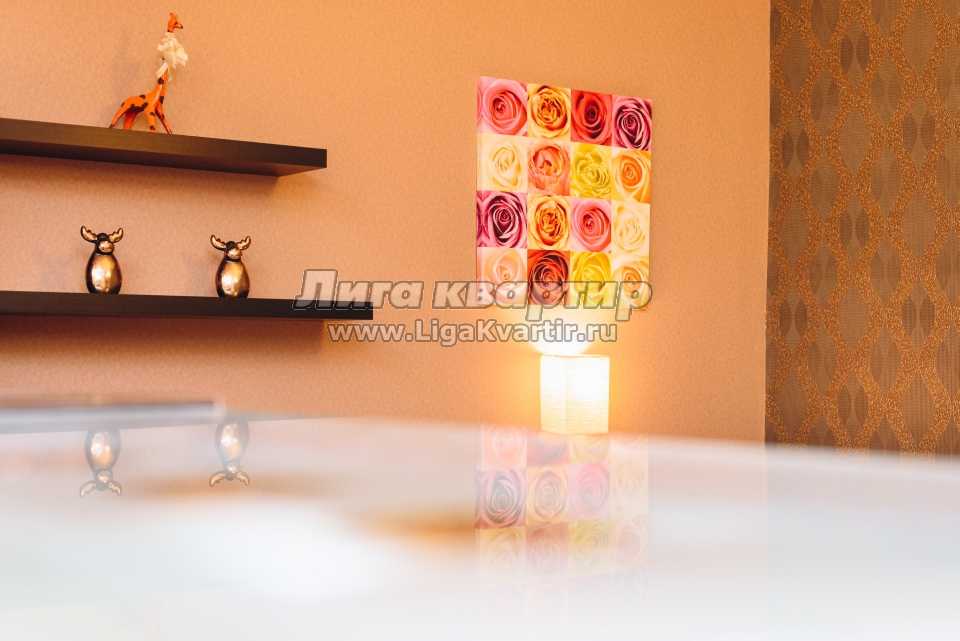 Высокие потолки, большие пластиковые окна с рулонными жалюзи для спокойного сна и отдыха, зональное освещение квартиры, барная стойка с подсветкой. Кухня: столовые приборы, кухонные принадлежности, посуда, гарнитур со встроенной техникой, микроволновка, холодильник, вытяжка, варочная поверхность, обеденная зона. Комната: большая кровать c красивым балдахином для уединения, двуспальный диван, столик, телевизор с кабельным телевидением, комод и шкаф для хранения вещей и одежды. Ванна: совмещенный санузел, импортная сантехника, душевая кабинка.