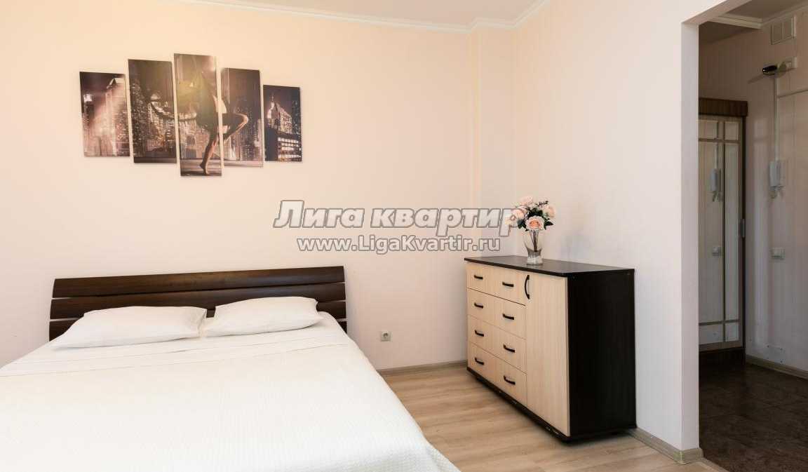 Белая мягкая кровать рядом с эркерным окном, струящееся золотое полотно пайеток роскошной каскадной люстры завораживают и притягивают взгляд. Эта квартира - отличный выбор для пары или одного человека.