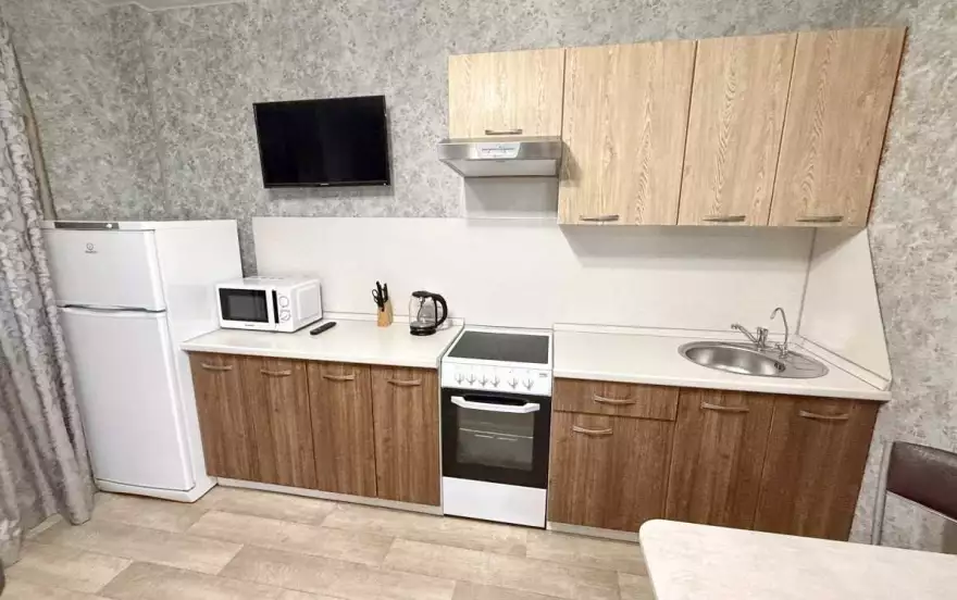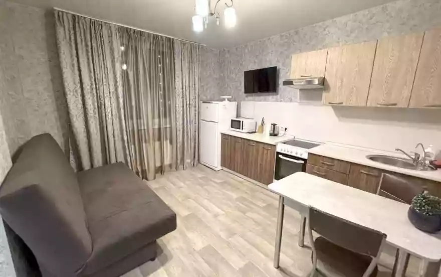 Из мебели и техники имеется все необходимое для комфортного проживания. В комнате: большая 2-х спальная кровать, диван, еще 2-х спальный диван, телевизор, шкаф. Кухня полностью оборудована: холодильник, микроволновая печь, посуда.