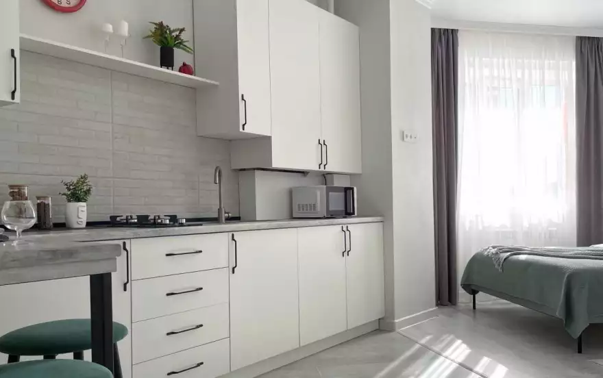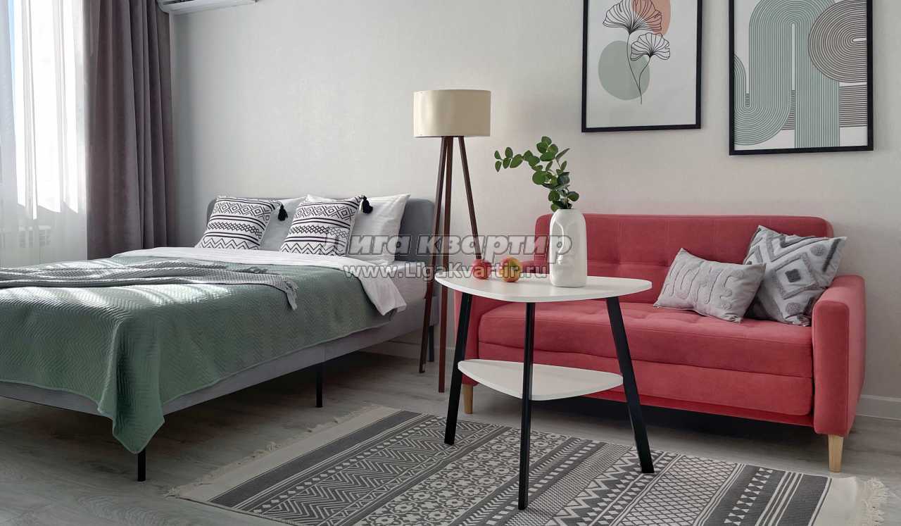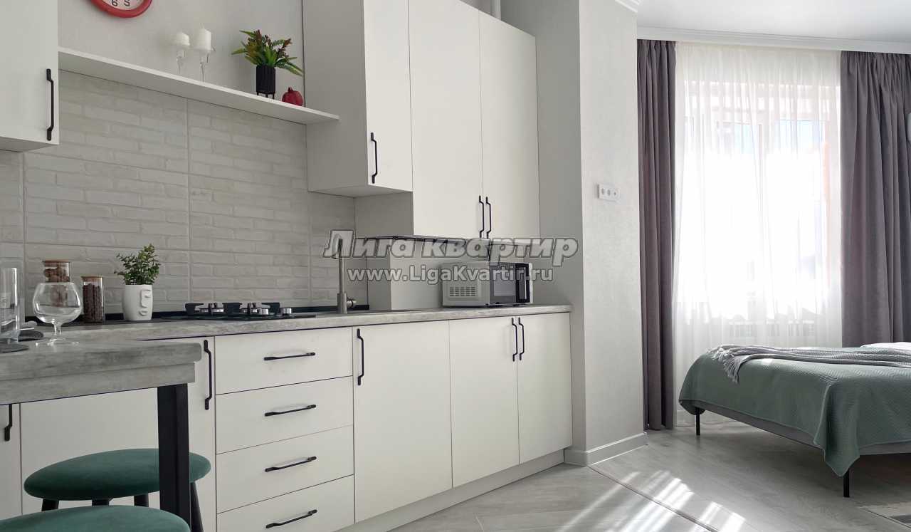 Стильная просторная студия расположена в новом современном ЖК вблизи центра курортной жизни.