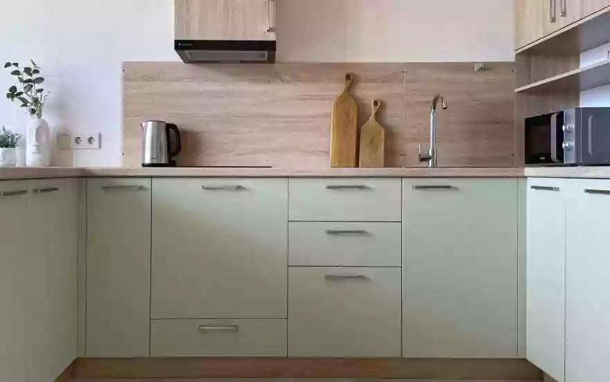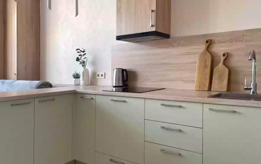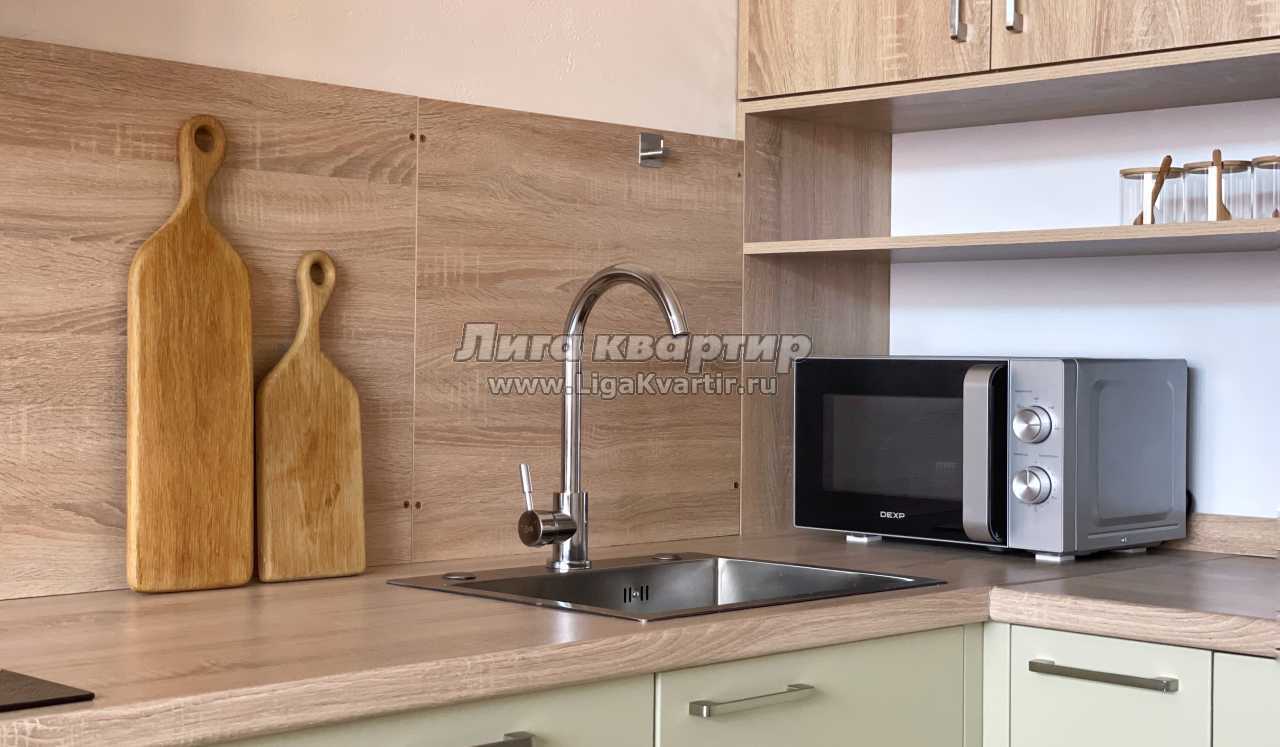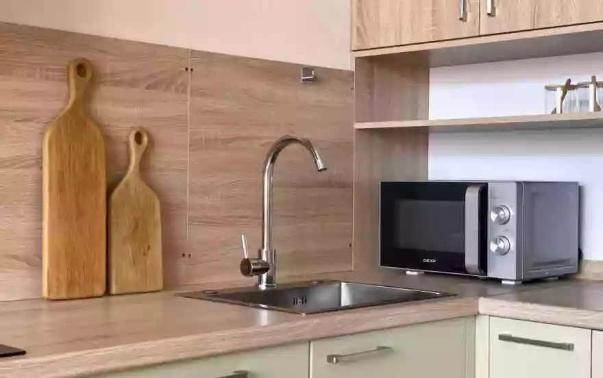 - Современная кухня с необходимой бытовой техникой: микроволновая печь, большой холодильник, электрическая плита, чайник, мультиварка.