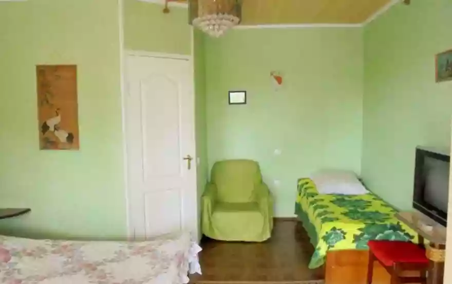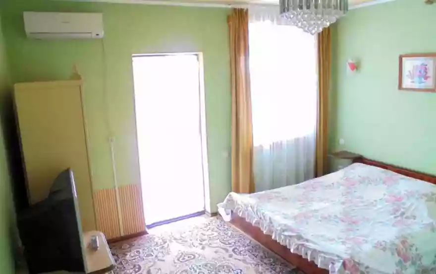 Сдаётся двухкомнатный домик с террасой на 3-7 человек. Состоит из двух номеров. Номера раздельные. Вход в каждый номер с террасы. В первом номере имеются: диван-кровать, две односпальные кровати, шкаф, две прикроватные тумбочки, столик с зеркалом, телевизор с кабельным TV, душ, туалет, кондиционер (сплит-система). Во втором номере имеются: двуспальная кровать, односпальная кровать, шкаф, кресло, телевизор с кабельным TV, душ, туалет, кондиционер (сплит-система). Зона Internet Wi-Fi по всему домику. Большая терраса с видом на город. На террасе - кухня на два номера со всей необходимой посудой для приготовления и приема пищи, два холодильника, два стола и стулья. Холодная и горячая вода круглосуточно, так как в этом дворе имеются запасные емкости на одну тонну воды, что очень облегчает отдых. Услуга стирки предоставляется бесплатно.