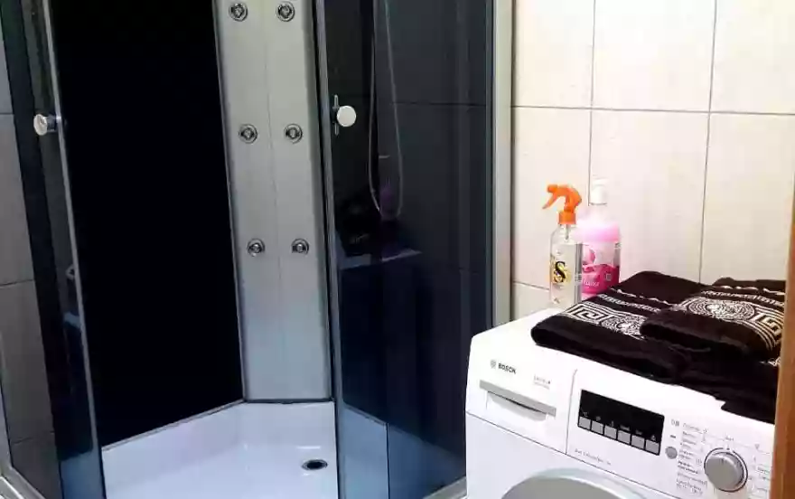 Ванная комната совмещена с санузлом. В вашим распоряжении душевая кабина, стиральная машина и большие мягкие полотенца.