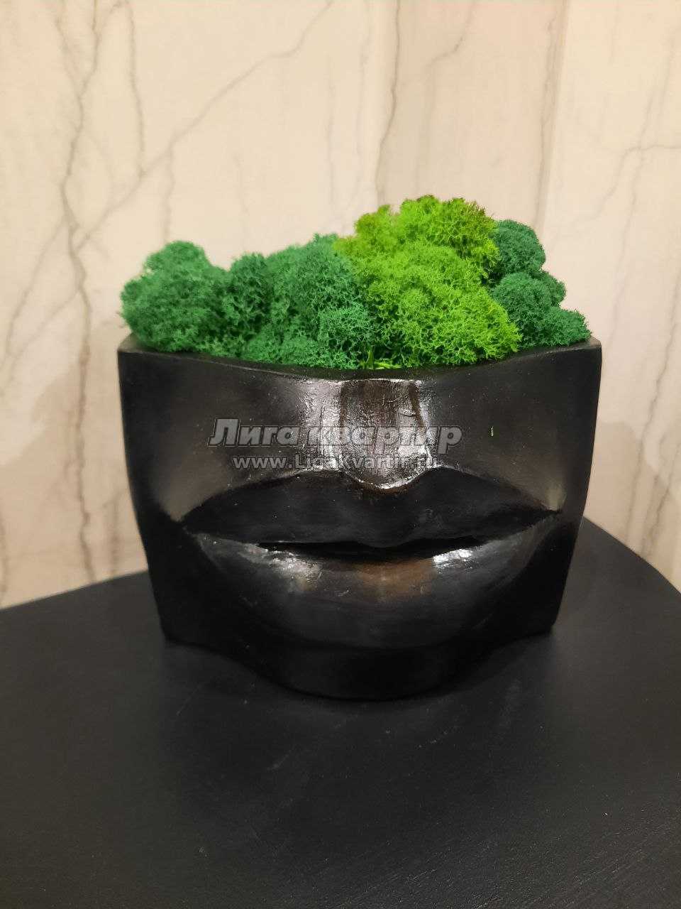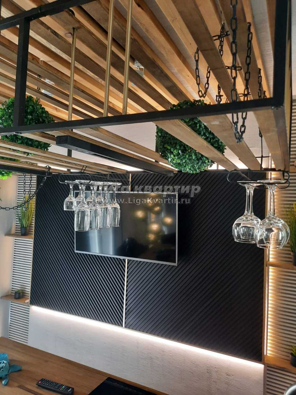 Красивые бокалы подвешены над островом. Столовую украшает картина со свежими растениями (стабилизированный мох).