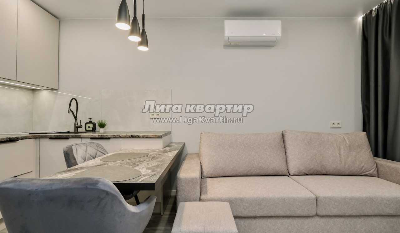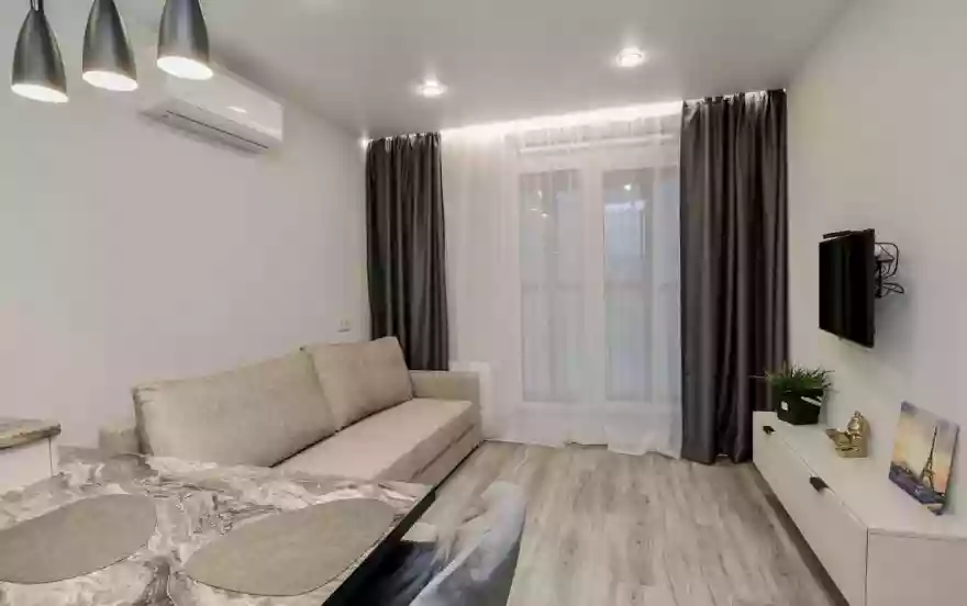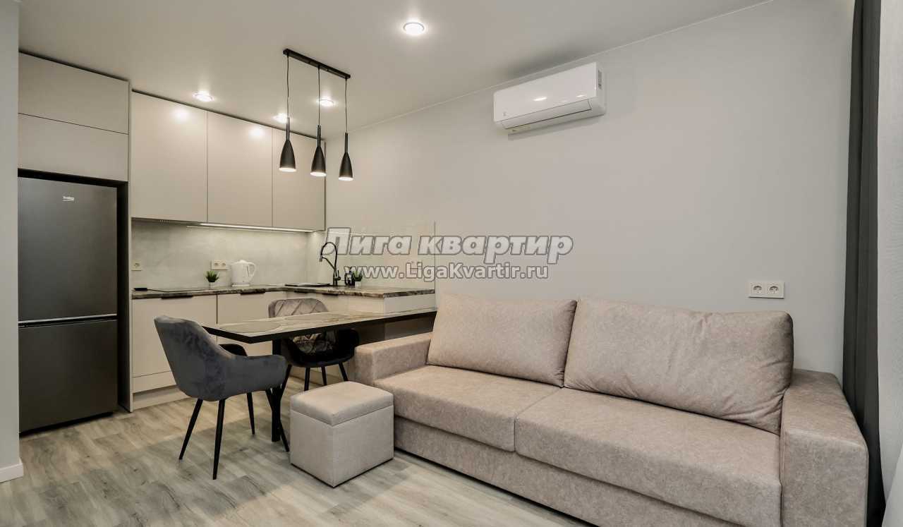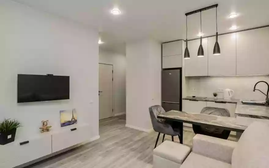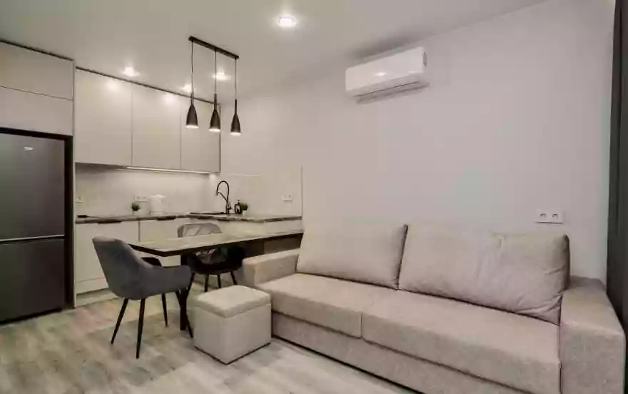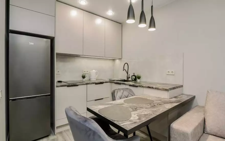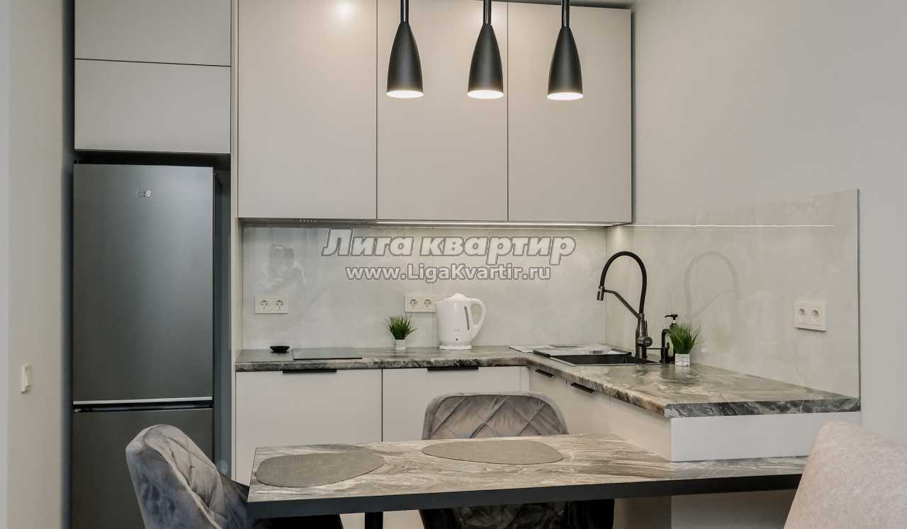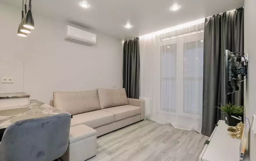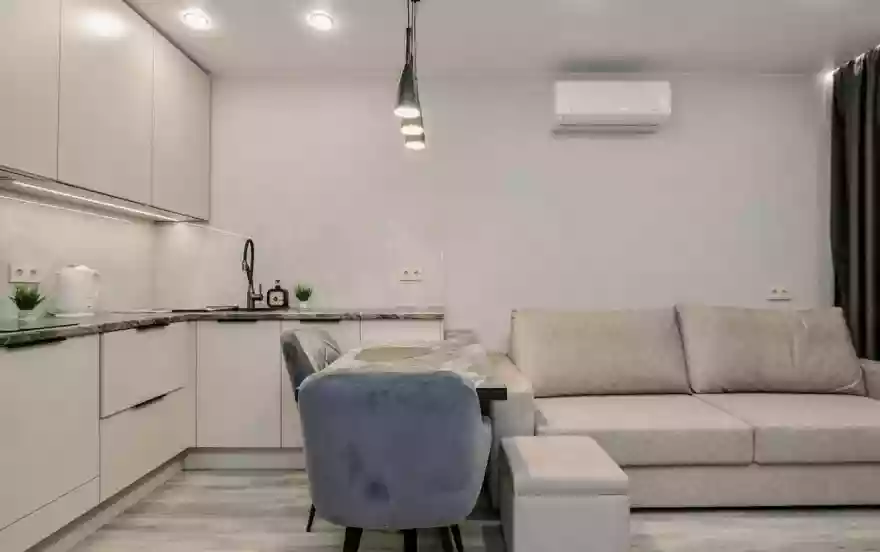 - Современная кухня-гостиная с обеденным столом, где можно приготовить вкусную еду и отдельная зона с раскладным диваном