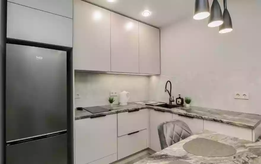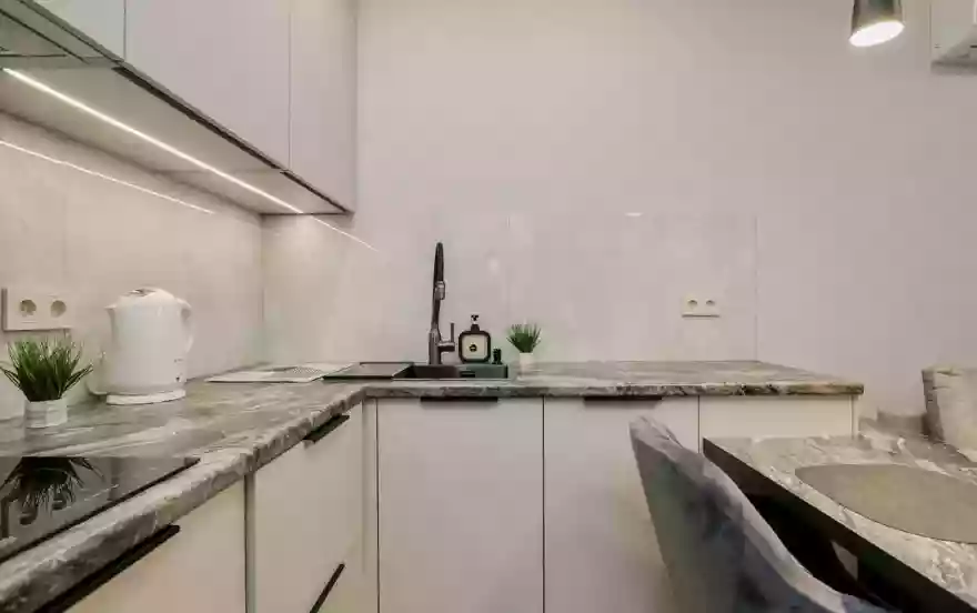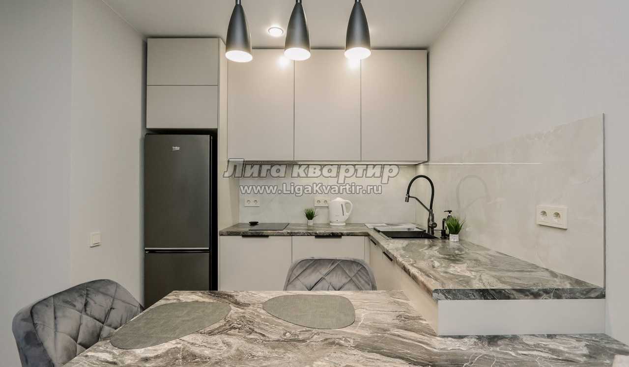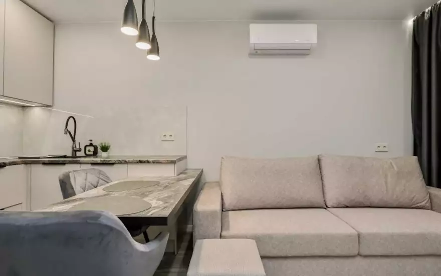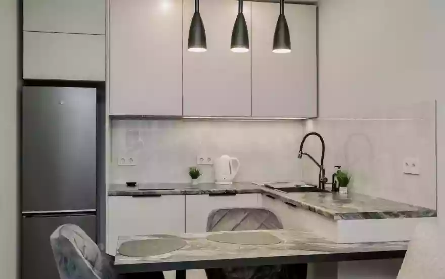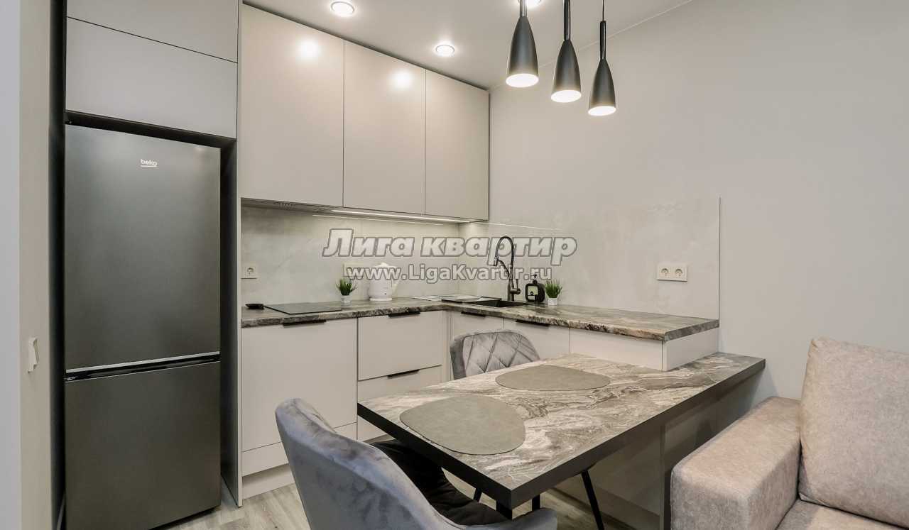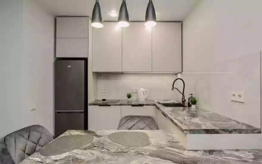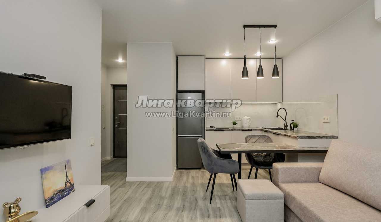 - Современная кухня-гостиная с обеденным столом, где можно приготовить вкусную еду и отдельная зона с раскладным диваном