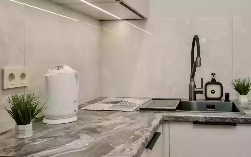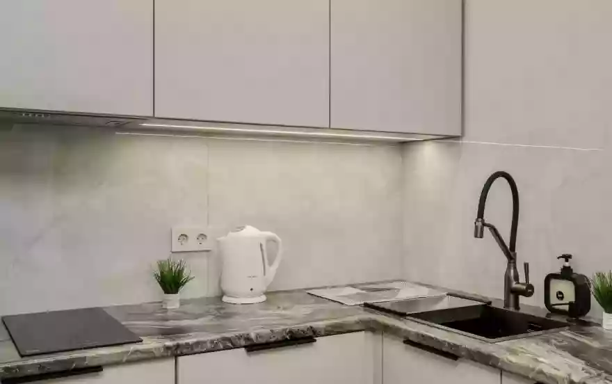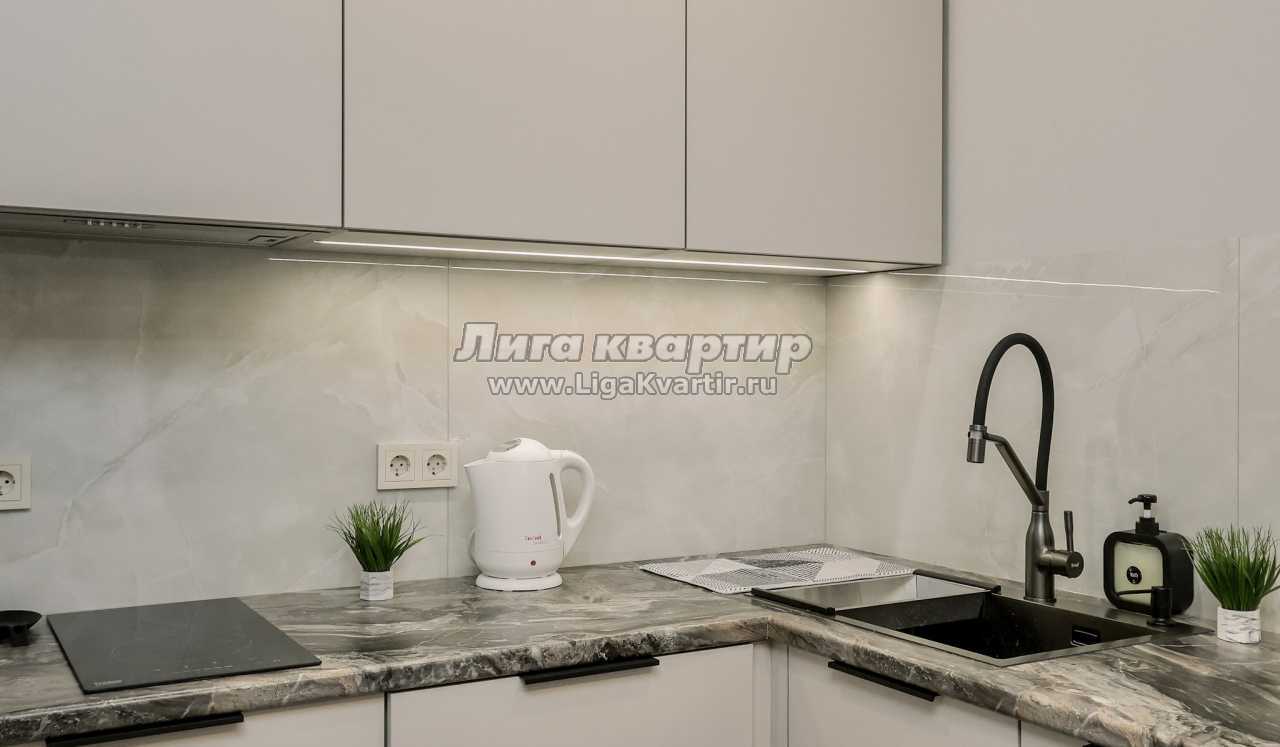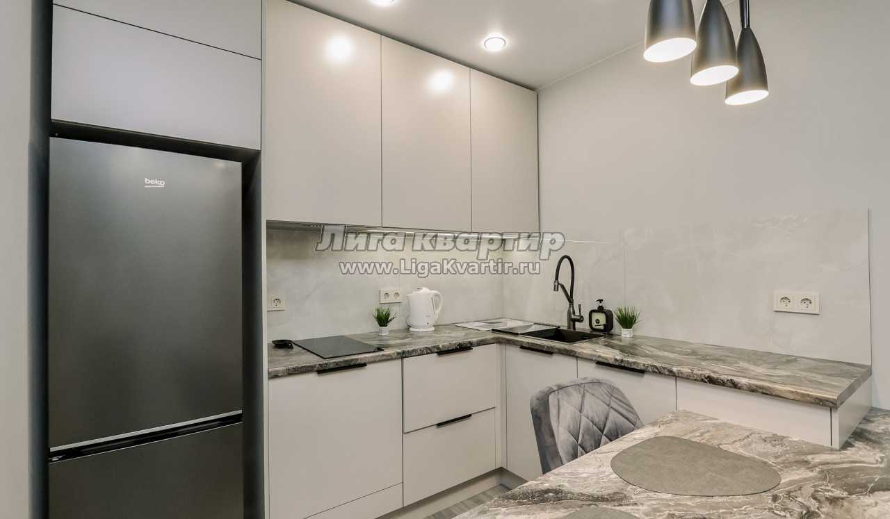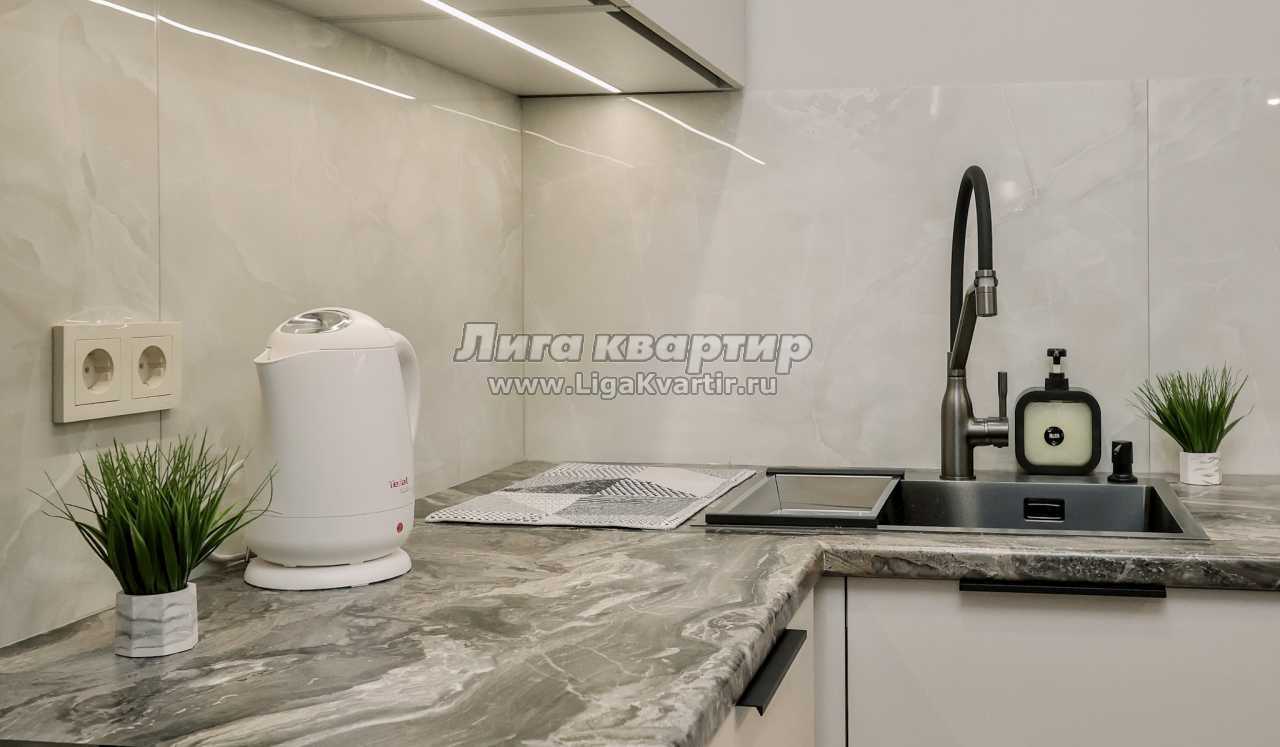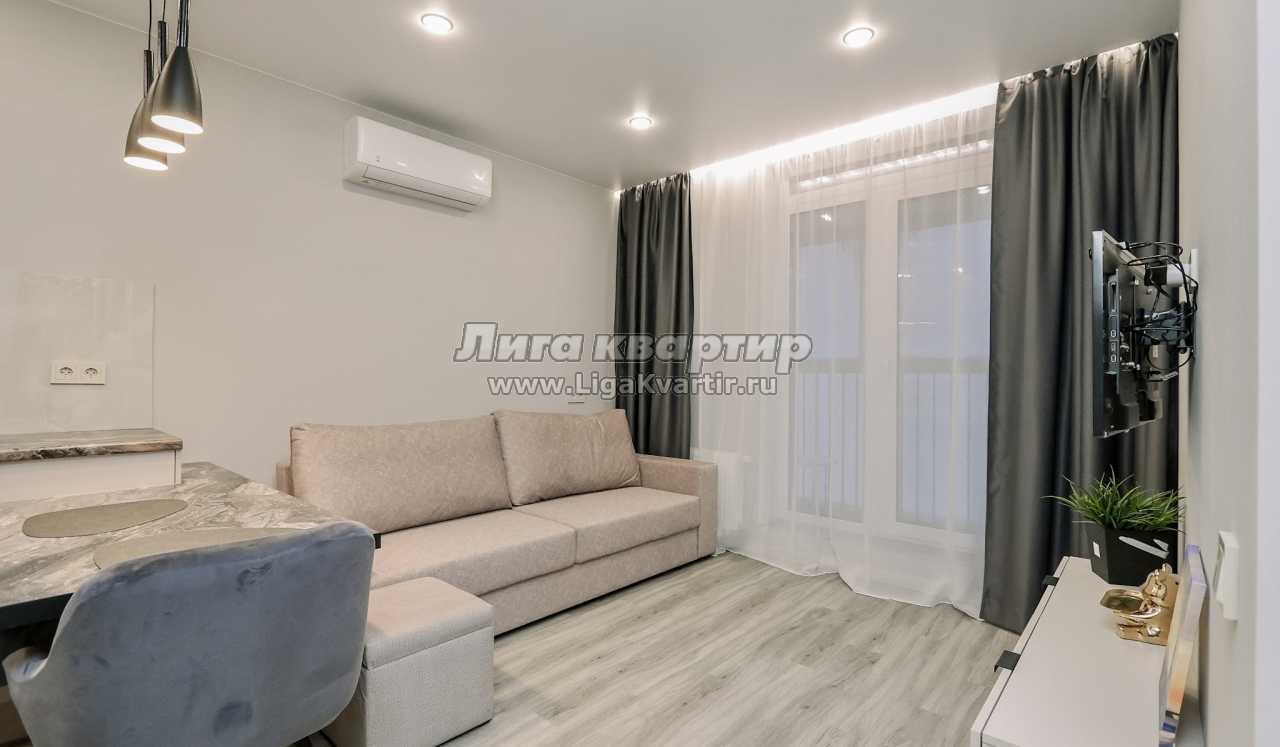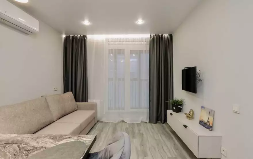 - Современная кухня-гостиная с обеденным столом, где можно приготовить вкусную еду и отдельная зона с раскладным диваном