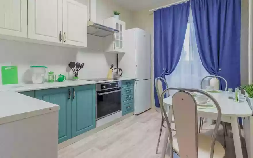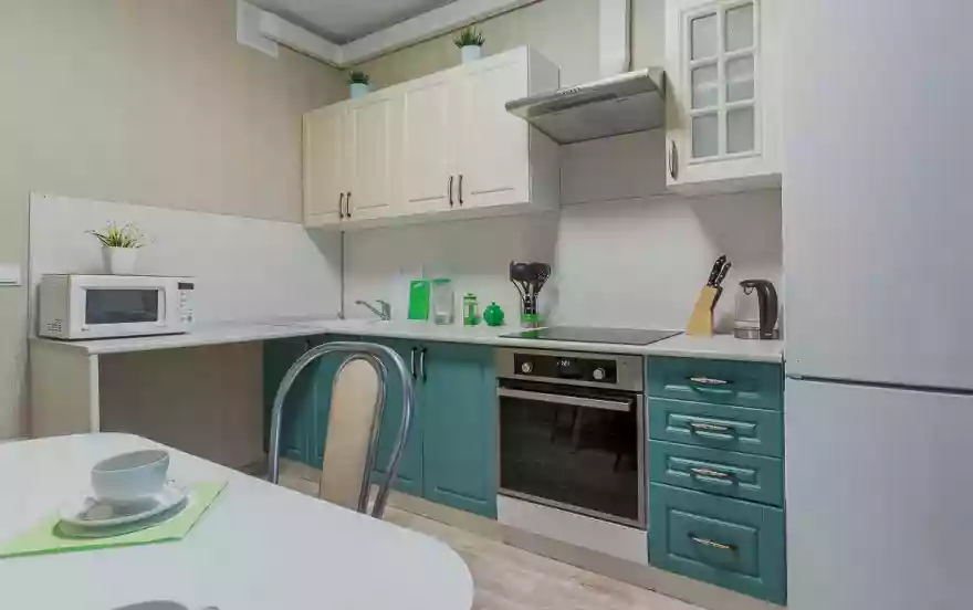 ✔ Светлая просторная кухня оснащена стильным кухонным гарнитуром, всей необходимой для длительного проживания бытовой техникой. Имеется полный комплект посуды на пять персон гостей, что обеспечит приготовление любого домашнего рациона на свой вкус.