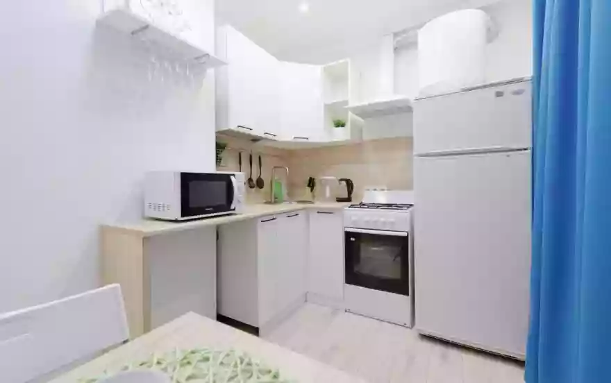 - Белоснежная просторная кухня содержит всю необходимую для краткосрочного и длительного проживания мебель и бытовую технику. Имеется полный комплект посуды и кухонной утвари по числу гостей квартиры.