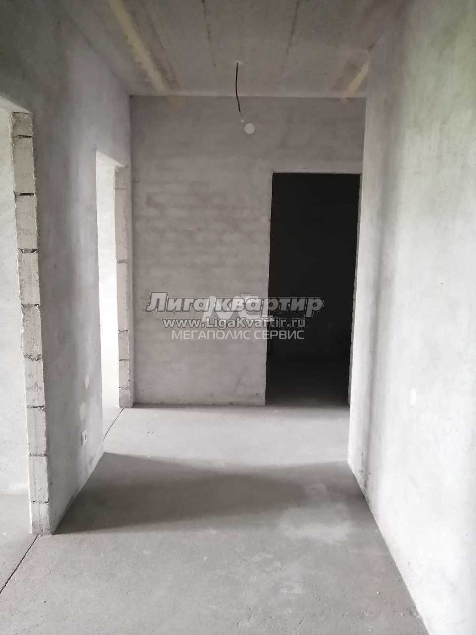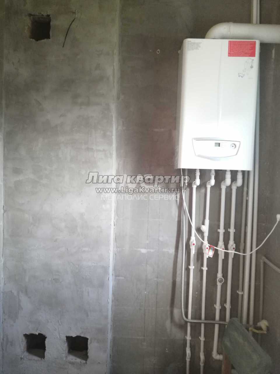 Стяжка пола выравнена, на кухне висит котел, установлены радиаторы, розетки, выключатели.