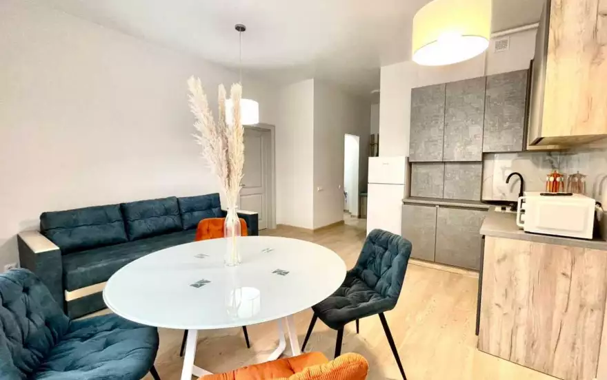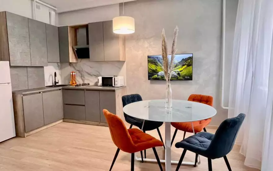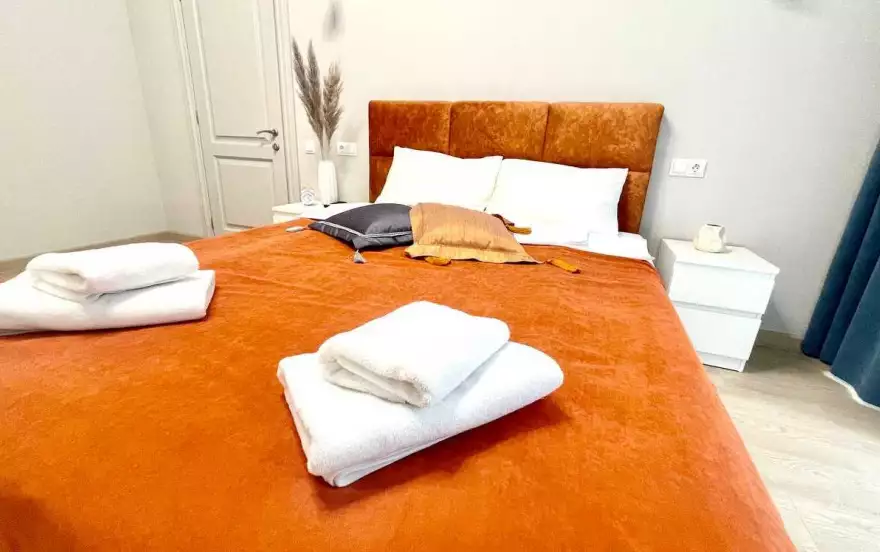 В квартире сделан современный ремонт, комнаты изолированы. Спальня оснащена двуспальной кроватью, а на просторной кухне организован гостевой уголок с раскладным диваном 160х200. Размещение в квартире возможно для 4-х человек. Комфортное проживание обеспечивают: чистое постельное белье, полотенца, тапочки, одноразовые гели, шампуни и мыло, фен, утюг с гладильной доской, ТВ, стиральная машина, электрический чайник и вся необходимая посуда для приготовления еды. Проведен бесплатный Wi-Fi.