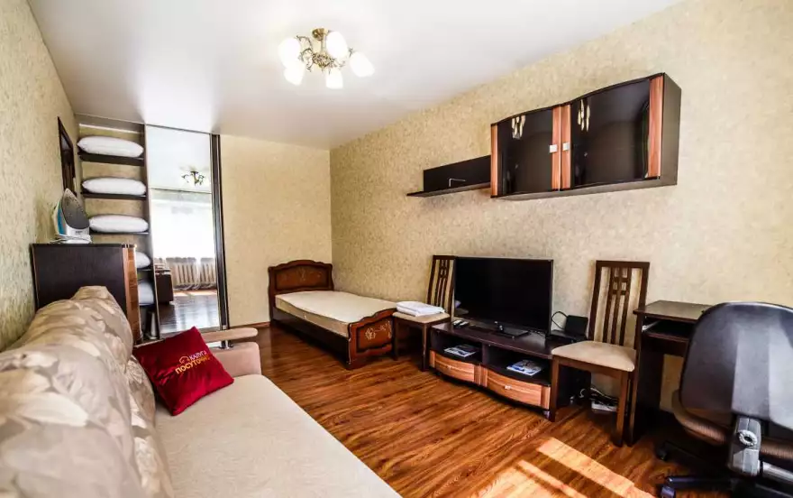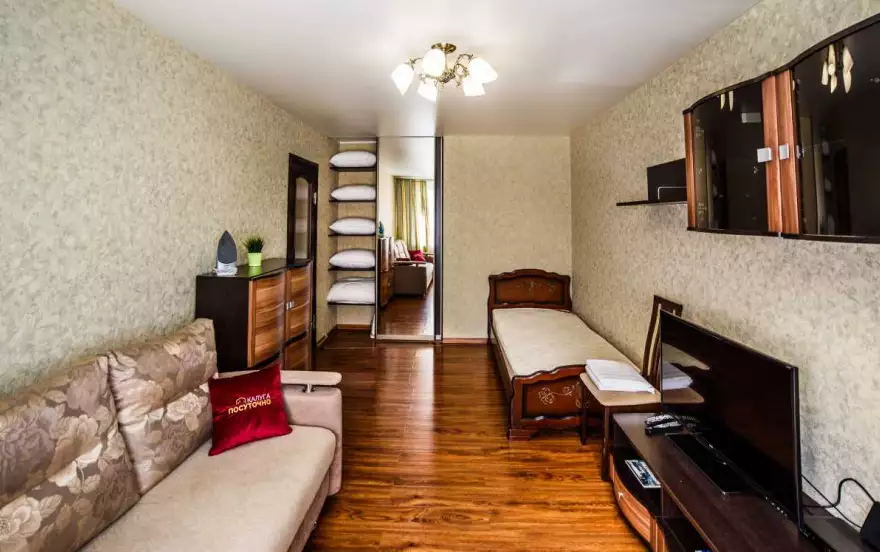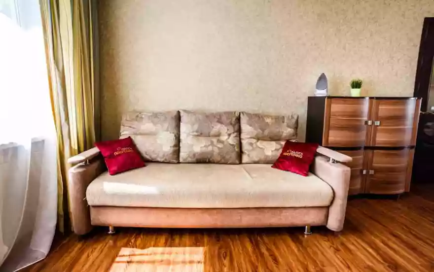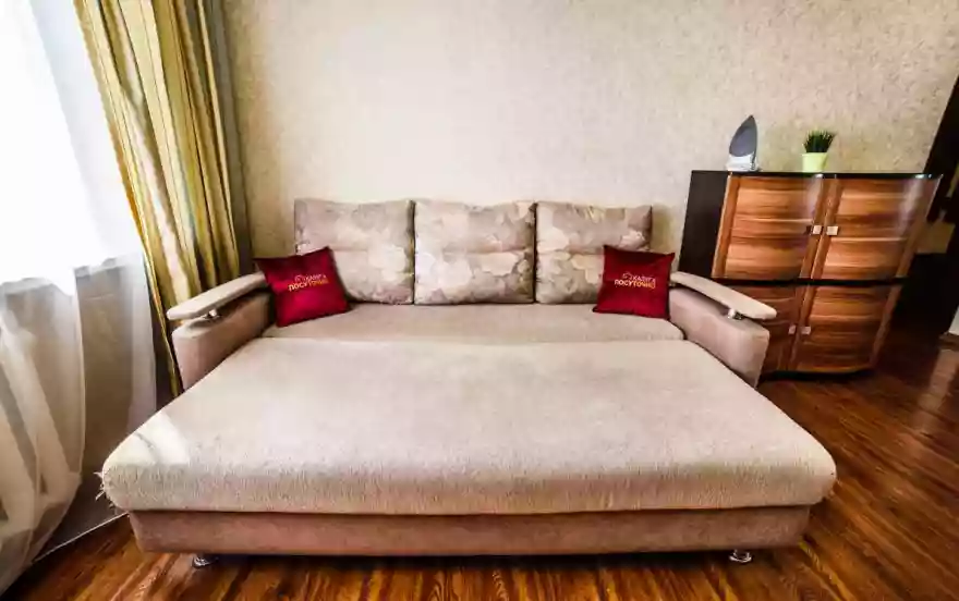 Широкая двуспальный диван - ширина 160 см. Заправлена отутюженным чистым бельем с приятным ароматом свежести.