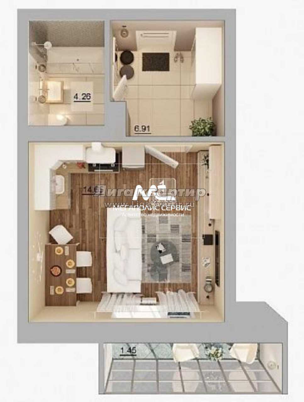 - Жилая площадь: 14.7 м²