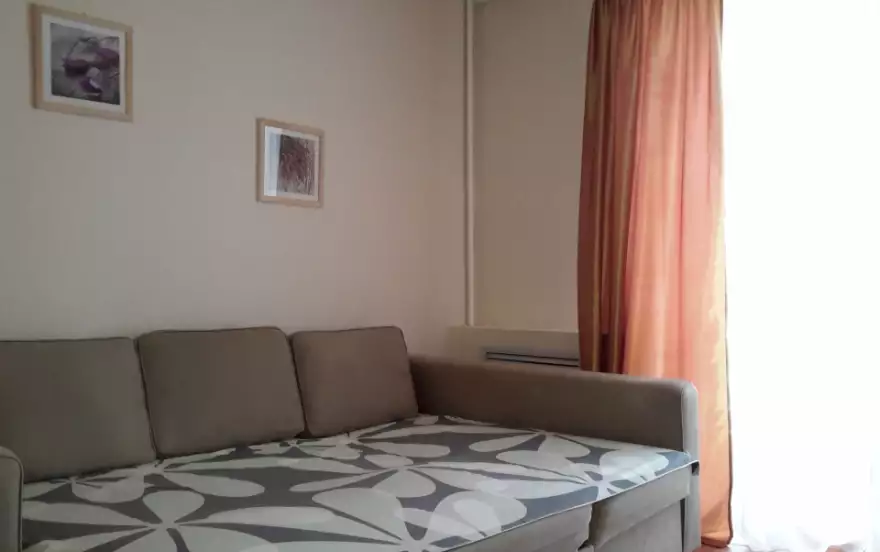 Мебель и бытовая техника и пр.: большой шкаф-купе, угловой диван - кровать, 2-спальная кровать, тумба под телевизор, столик, ЖК телевизор, СВЧ - печь, холодильник, стиральная машина автомат, электрочайник, фен, утюг, гладильная доска. На кухне есть все необходимые приготовления и сервировки пищи.