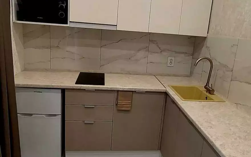 полностью оборудованная кухня: варочная панель, чайник, холодильник с морозильной камерой, посуда для готовки, микроволновая печь