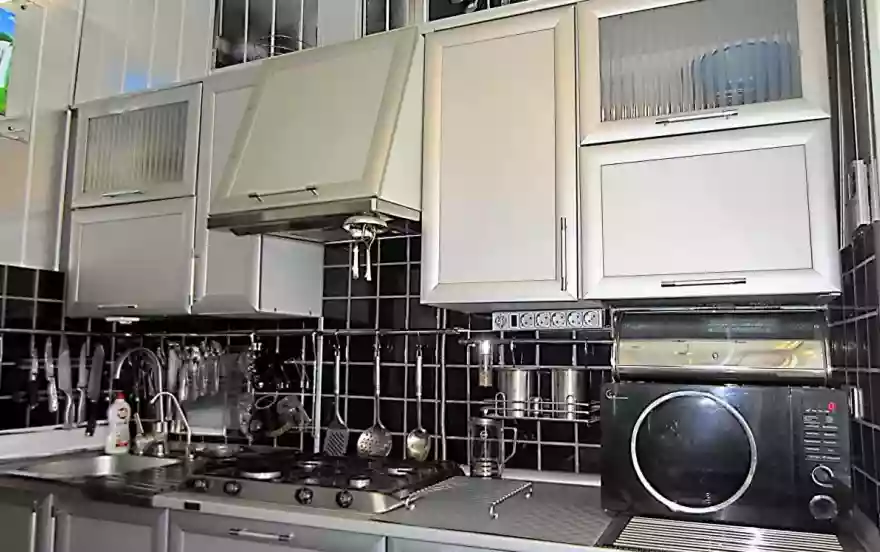 На кухне второй телевизор, варочная панель, эл.вытяжка, большой холодильник, микроволновка, эл. чайник, встроенный фильтр питьевой воды. Есть вся необходимая посуда для приготовления и приёма пищи, моющие средства, бытовые мелочи, а так же чай, соль, сахар, специи.