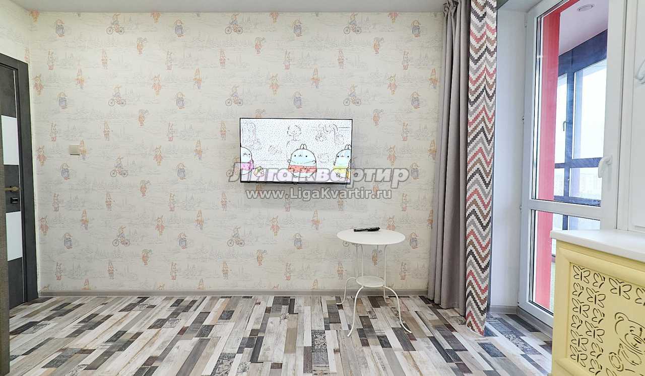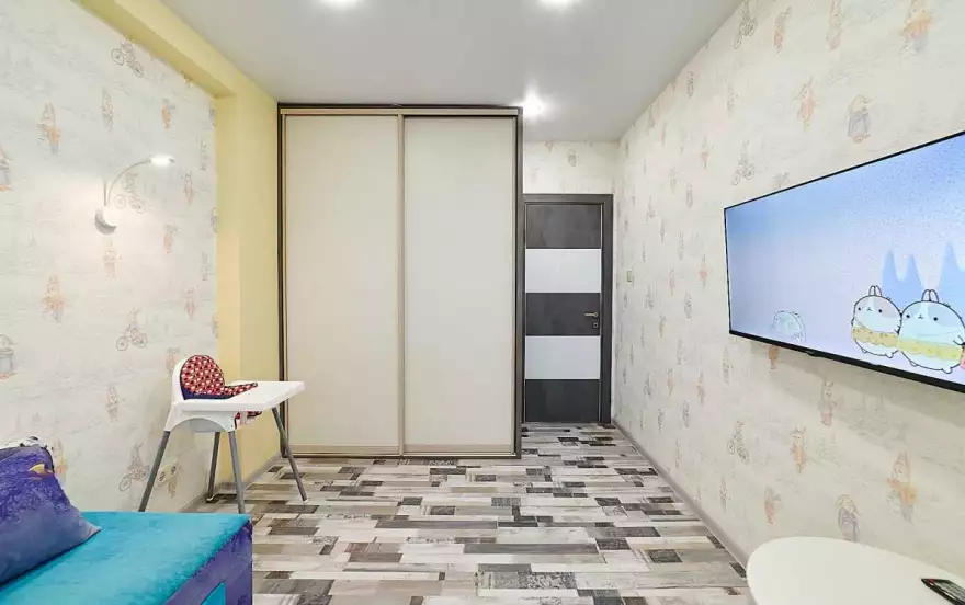 Также в квартире полноценная отдельная детская комната, имеется детский стульчик и кроватка, также в детской есть огромный шкаф и телевизор с мультиками.