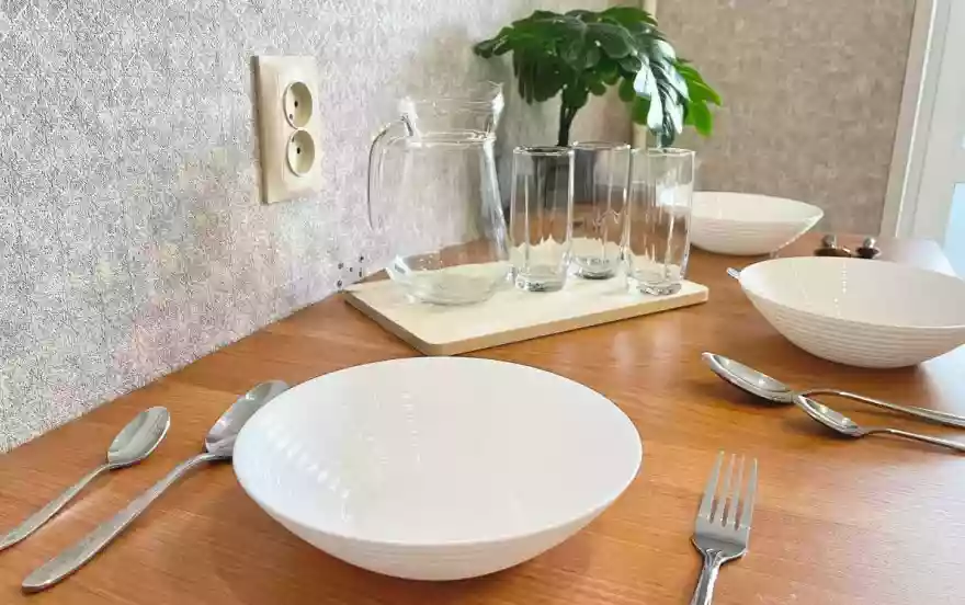 • Полностью оборудованная кухонная зона мебелью и посудой