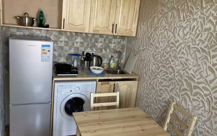 В квартире есть: кухня, холодильник, индукционная плита, стиральная машина, кондиционер, большой телевизор с тонким экраном (диагональ 1 м) с подпиской сервиса онлайн кинотеатров Окко и КиноПоиск.