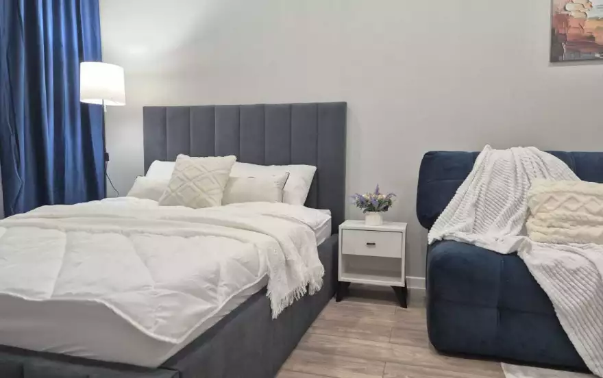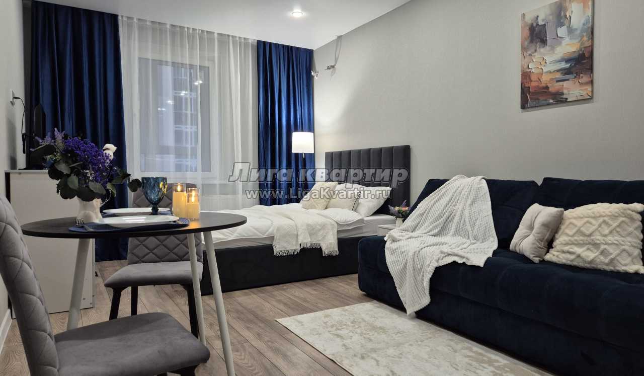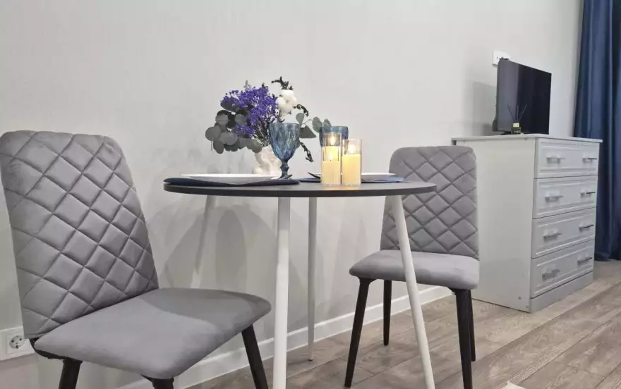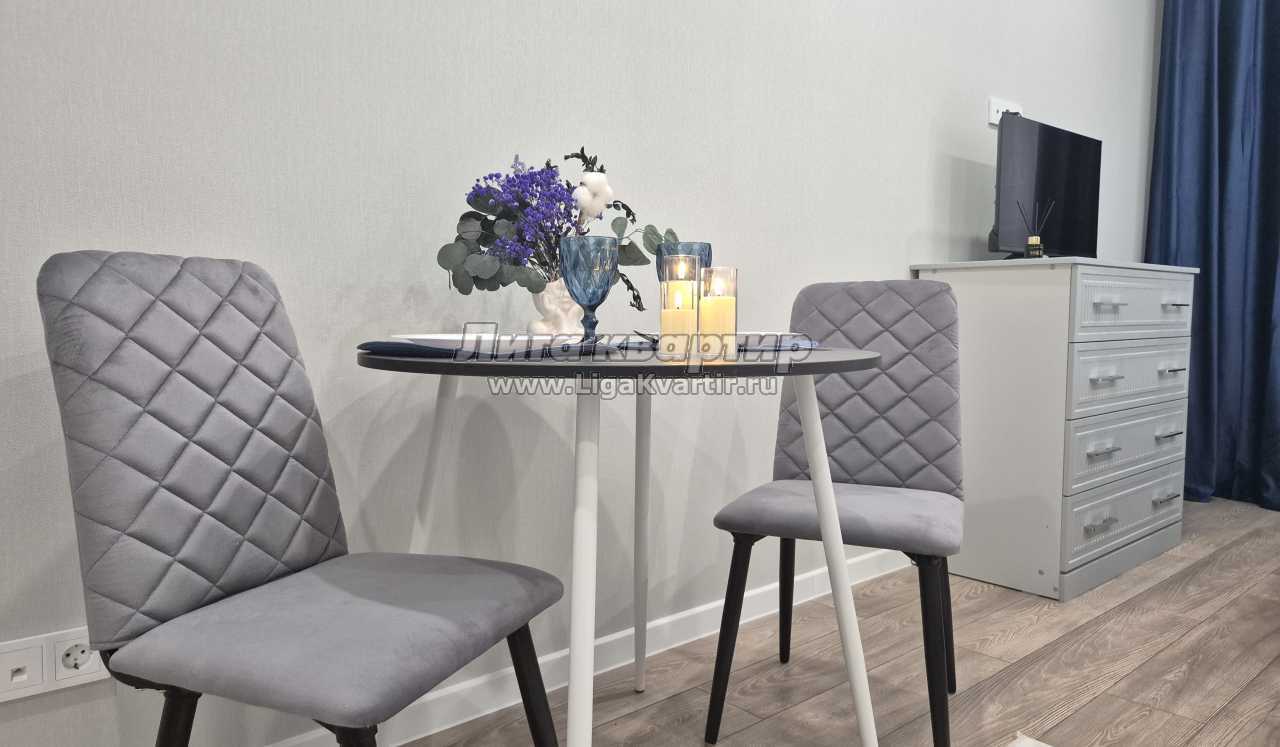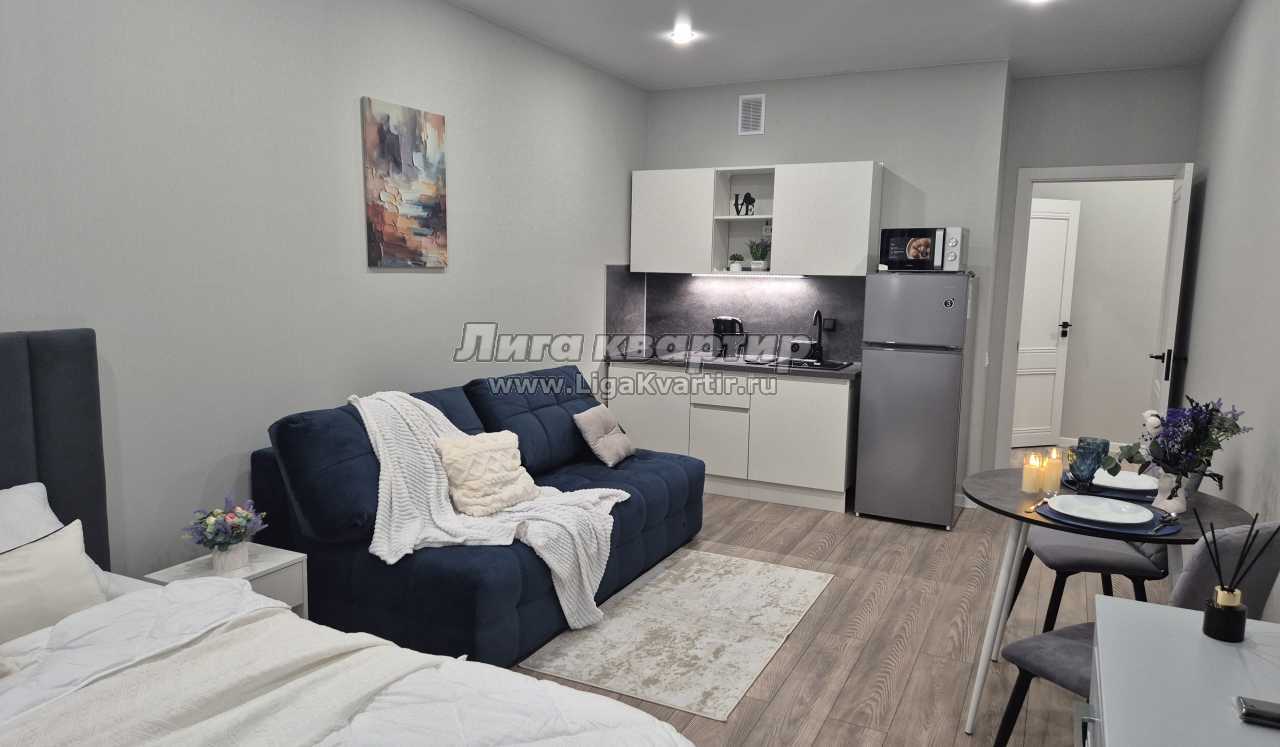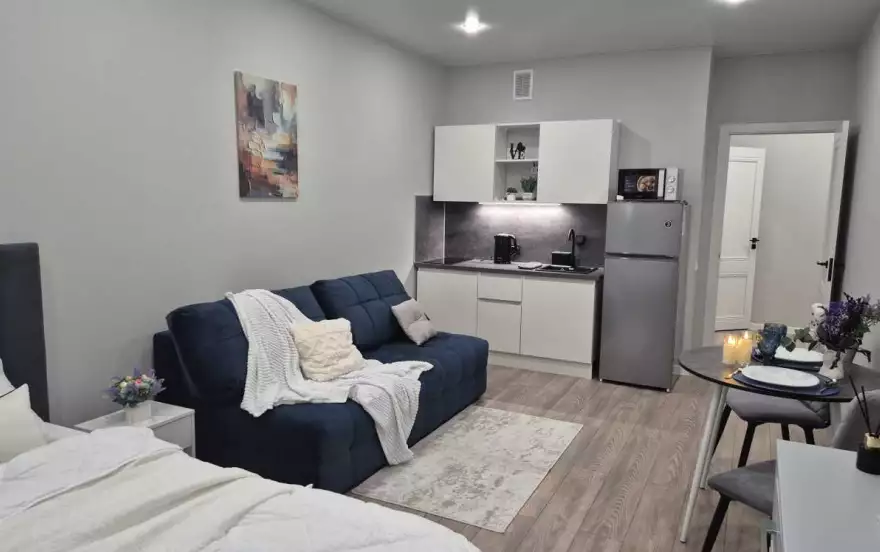 Квартира оформлена в современном стиле с уютными элементами. Просторная студия с мягкой мебелью и телевизором станет идеальным местом для отдыха. Полностью оборудованная кухня с обеденной зоной позволит вам организовать вкусный ужин.
