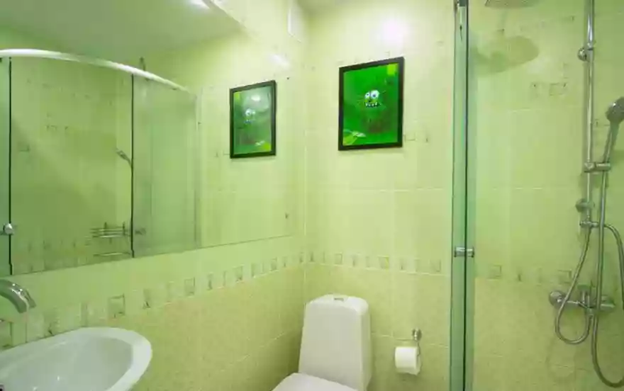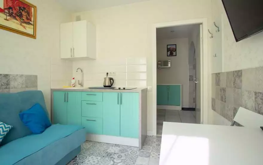 Присутствует вся необходимая бытовая техника: микроволновая печь, чайник.