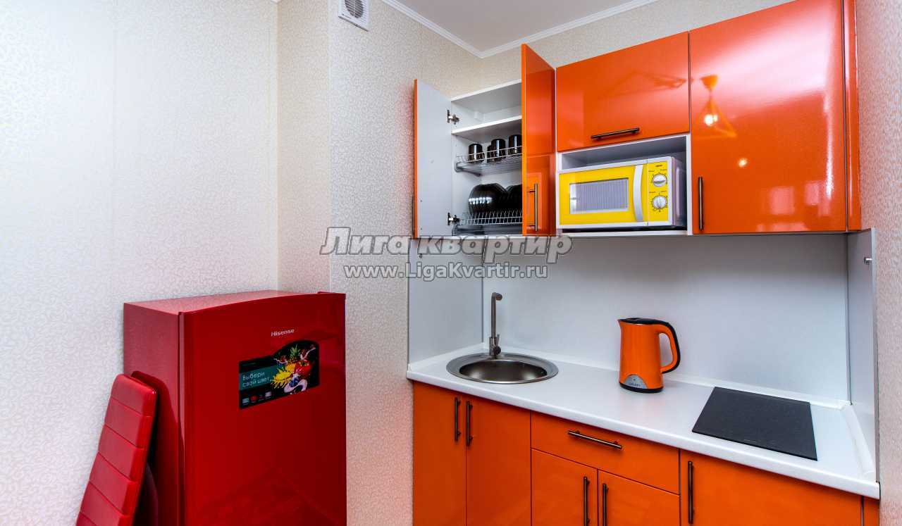 - кухонный гарнитур, керамическая плита, микроволновая печь, чайник, обеденный стол