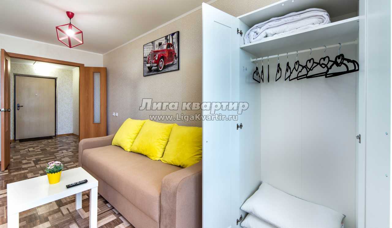 - диван двуспальный раскладной, двуспальная кровать, вместительный зеркальный шкаф для вещей, ЖК телевизор