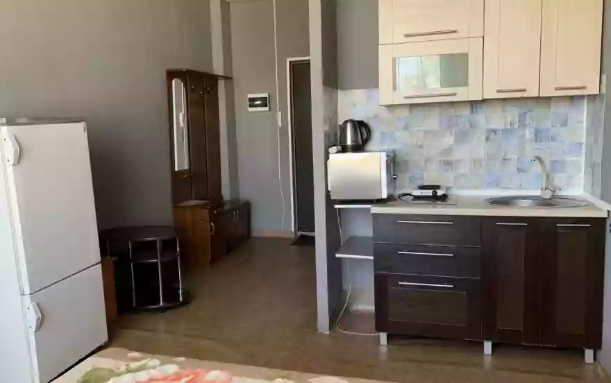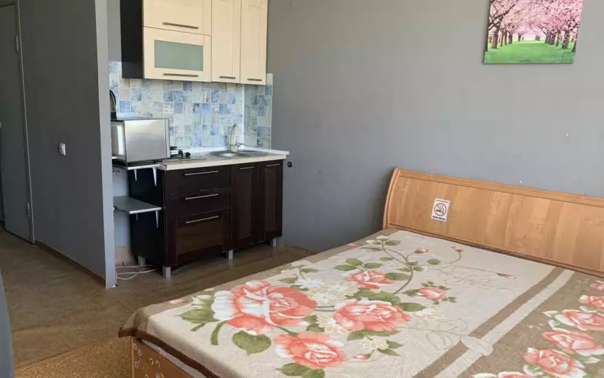 Уютная студия на Правом берегу, имеется все необходимое для комфортного проживания: мебель, бытовая техника, посуда и постельные принадлежности.